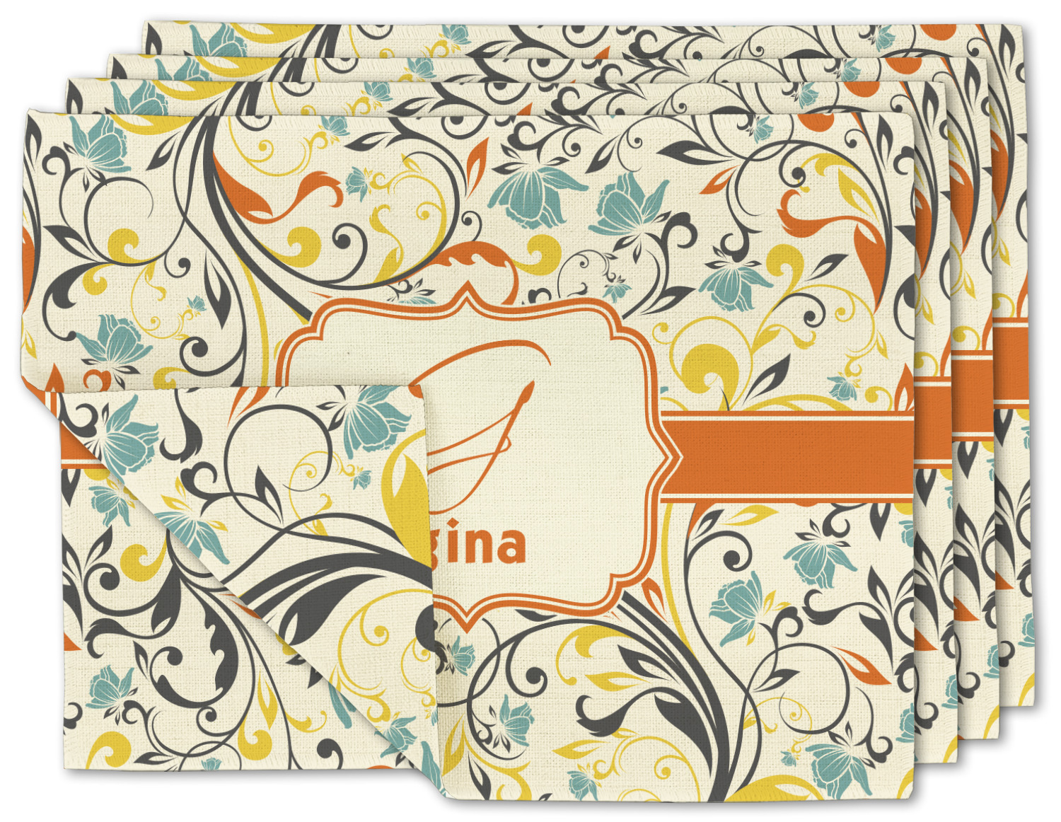 The design combines green, blue, and yellow flowers with swirls of black. The floral pattern is set on a background of white to showcase the print. The design has a classic ribbon in orange trimmed in white. The decorative white label is trimmed in orange. Add an initial and a name for that personal touch to pull the entire design together.