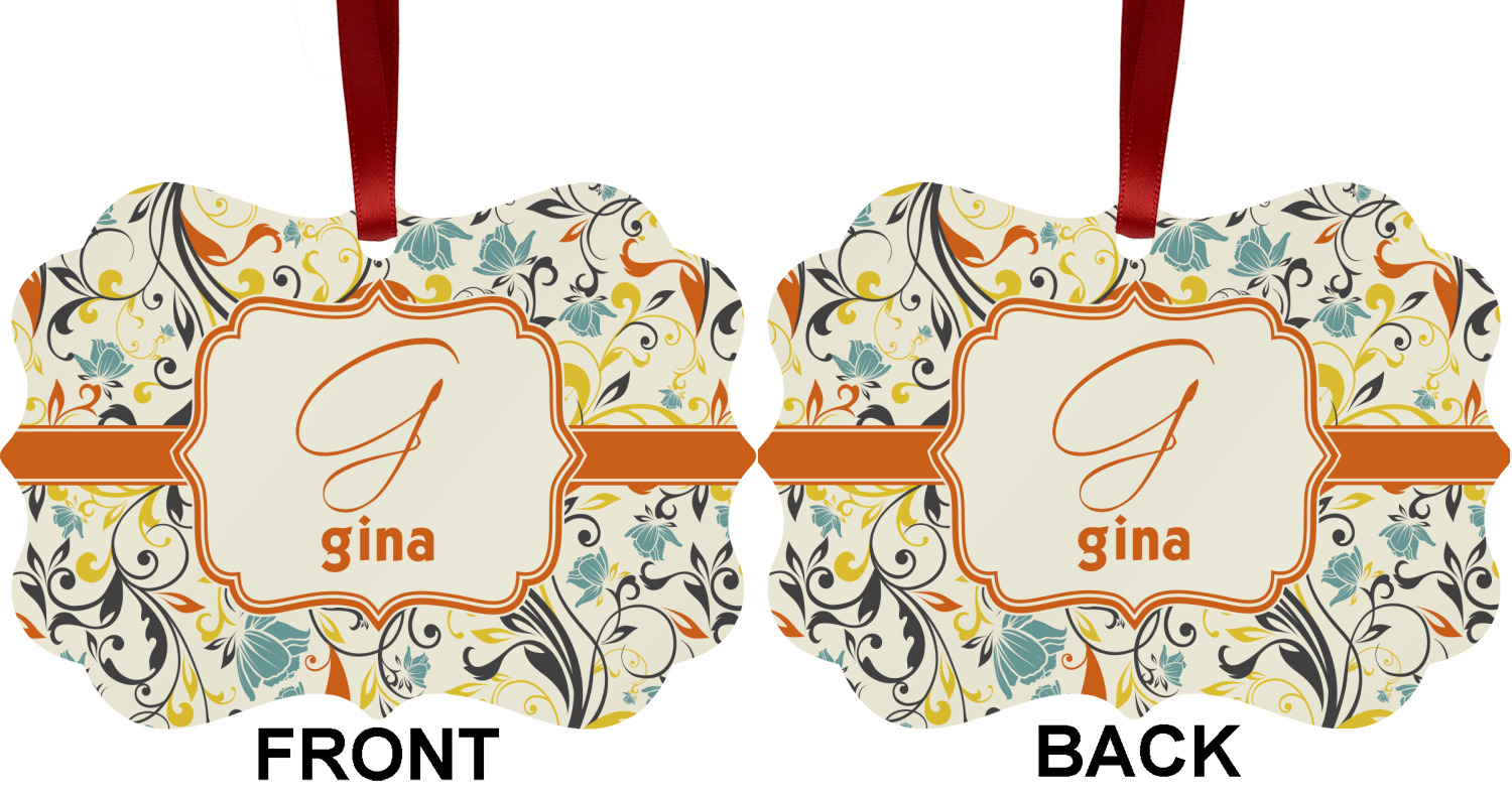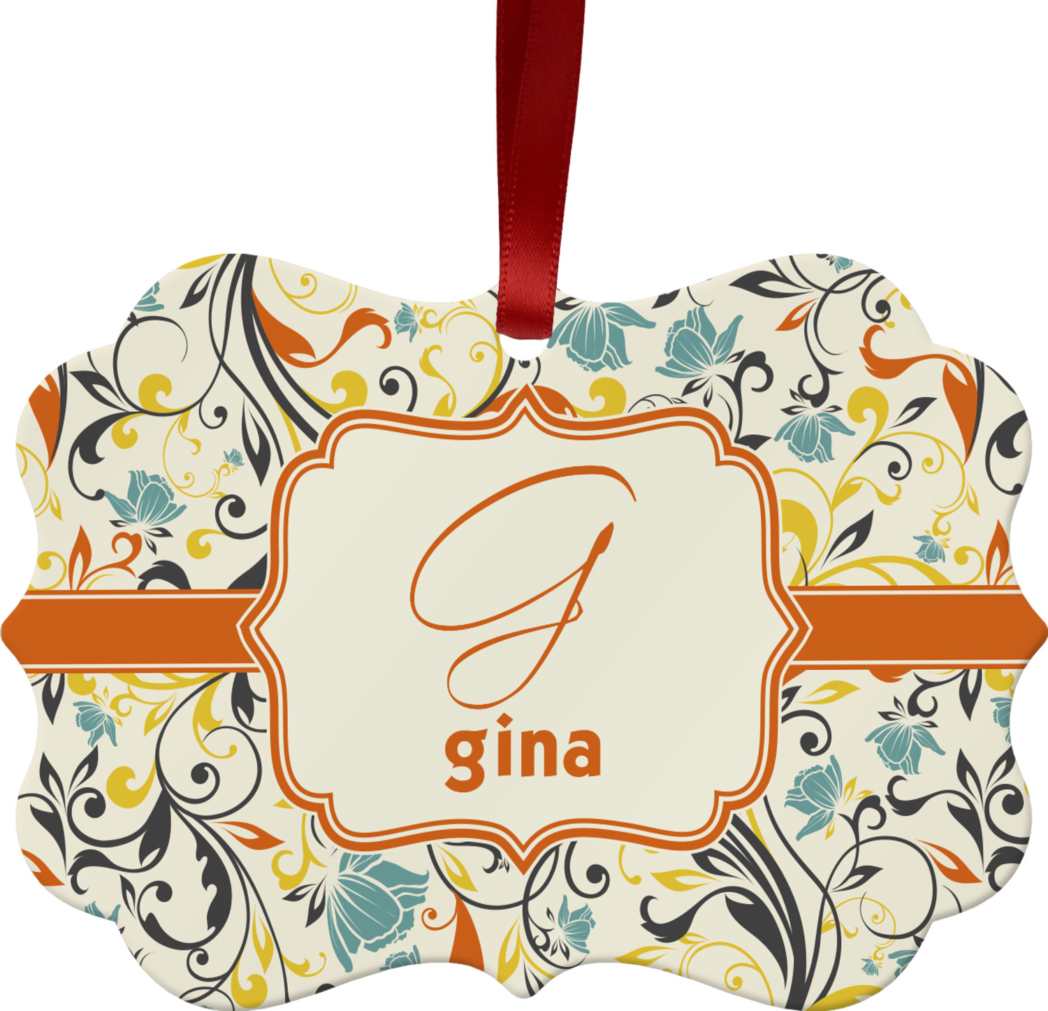 The design combines green, blue, and yellow flowers with swirls of black. The floral pattern is set on a background of white to showcase the print. The design has a classic ribbon in orange trimmed in white. The decorative white label is trimmed in orange. Add an initial and a name for that personal touch to pull the entire design together.