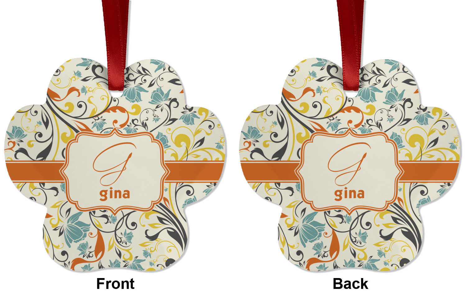 The design combines green, blue, and yellow flowers with swirls of black. The floral pattern is set on a background of white to showcase the print. The design has a classic ribbon in orange trimmed in white. The decorative white label is trimmed in orange. Add an initial and a name for that personal touch to pull the entire design together.