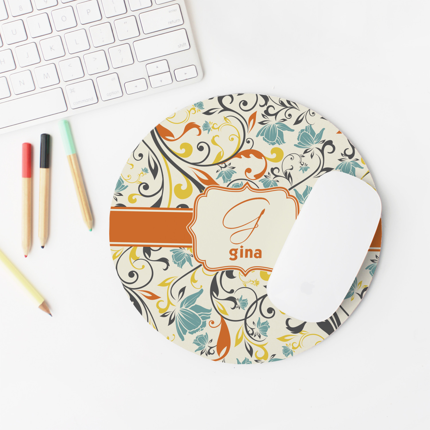 The design combines green, blue, and yellow flowers with swirls of black. The floral pattern is set on a background of white to showcase the print. The design has a classic ribbon in orange trimmed in white. The decorative white label is trimmed in orange. Add an initial and a name for that personal touch to pull the entire design together.