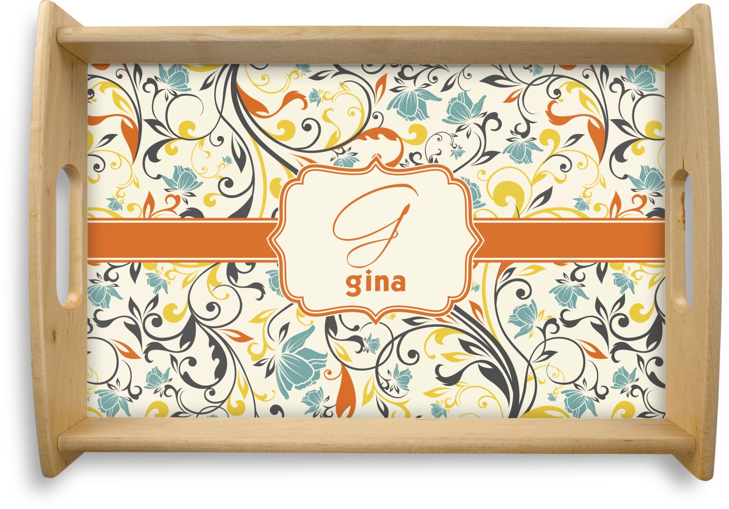 This serving tray with handles features square edges and two rounded sides, creating a very modern look. Each side is fabricated from a beautifully cut, natural wood. The bottom of the interior of the tray displays your customized design in bright, vibrant color. The tray is sold in both a black color and a natural wood look. Each variation of the wood serving tray has two sizes: Small, which is 14" x 10" x 2.25", and Large, which is 19.5" x 13.5" x 2.75".