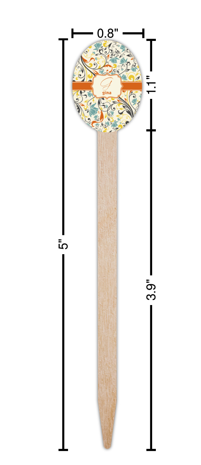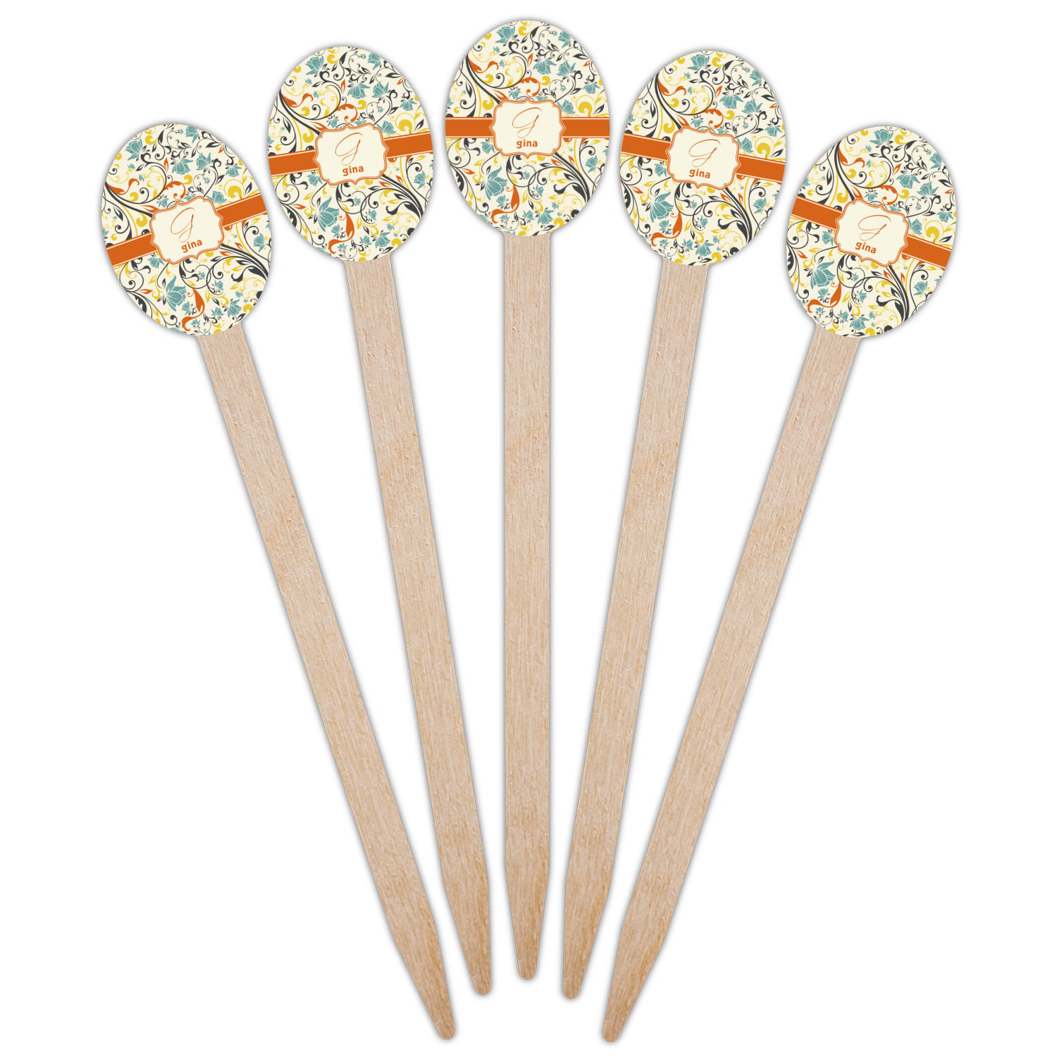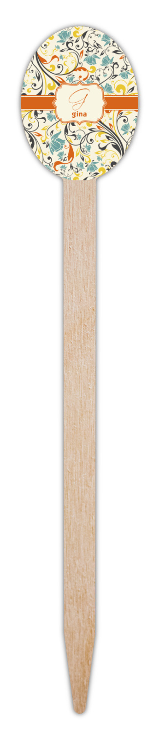 The design combines green, blue, and yellow flowers with swirls of black. The floral pattern is set on a background of white to showcase the print. The design has a classic ribbon in orange trimmed in white. The decorative white label is trimmed in orange. Add an initial and a name for that personal touch to pull the entire design together.