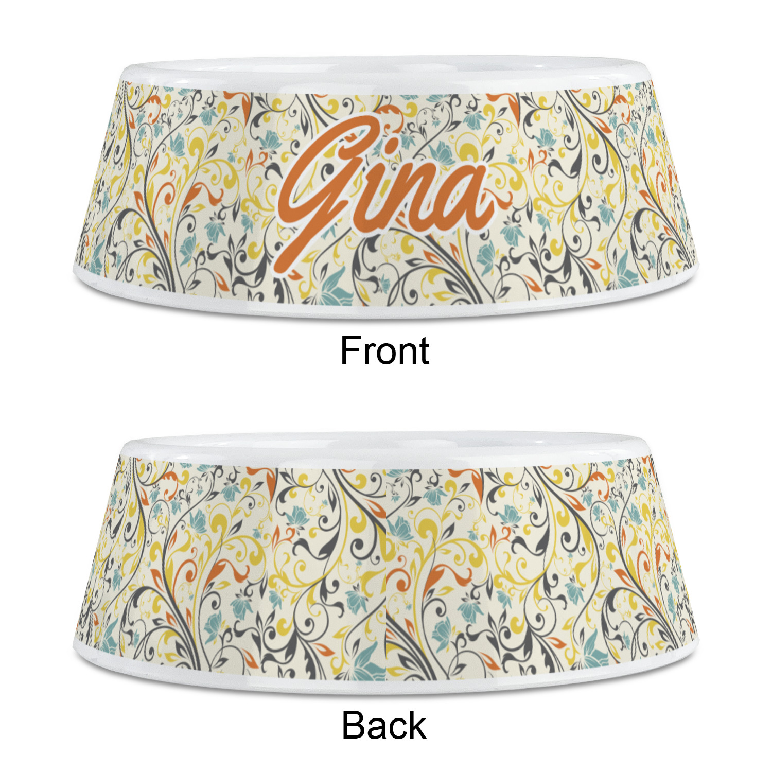 The design combines green, blue, and yellow flowers with swirls of black. The floral pattern is set on a background of white to showcase the print. The design has a classic ribbon in orange trimmed in white. The decorative white label is trimmed in orange. Add an initial and a name for that personal touch to pull the entire design together.