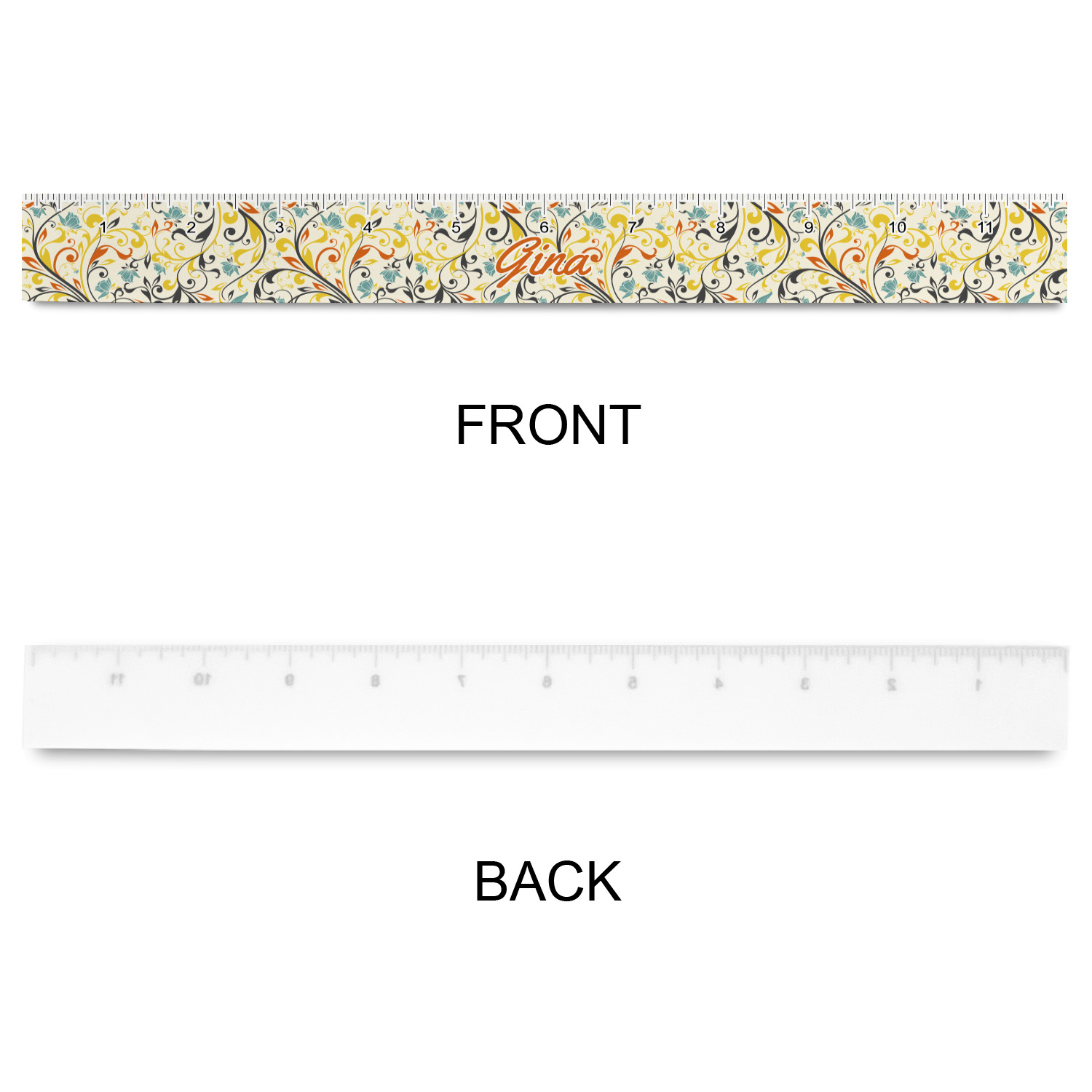 The design combines green, blue, and yellow flowers with swirls of black. The floral pattern is set on a background of white to showcase the print. The design has a classic ribbon in orange trimmed in white. The decorative white label is trimmed in orange. Add an initial and a name for that personal touch to pull the entire design together.