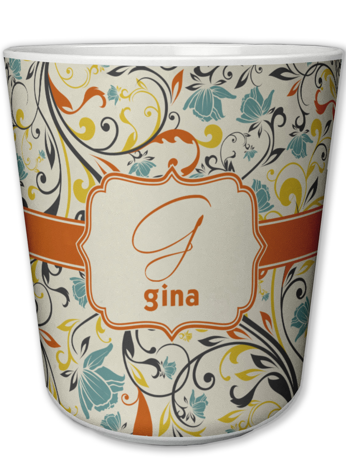 The design combines green, blue, and yellow flowers with swirls of black. The floral pattern is set on a background of white to showcase the print. The design has a classic ribbon in orange trimmed in white. The decorative white label is trimmed in orange. Add an initial and a name for that personal touch to pull the entire design together.