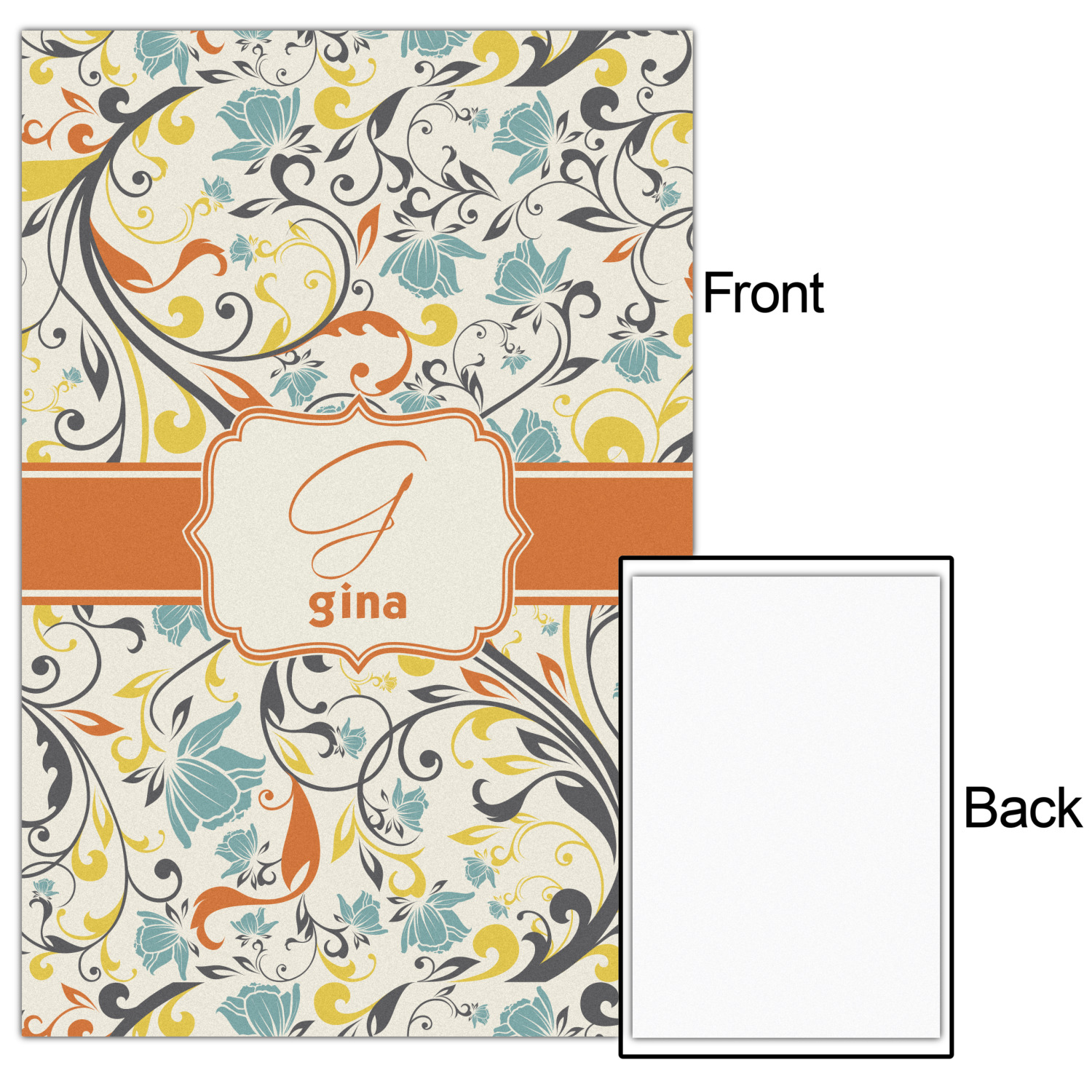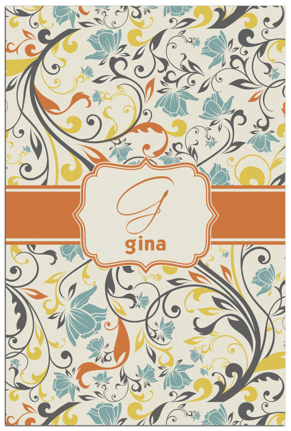The design combines green, blue, and yellow flowers with swirls of black. The floral pattern is set on a background of white to showcase the print. The design has a classic ribbon in orange trimmed in white. The decorative white label is trimmed in orange. Add an initial and a name for that personal touch to pull the entire design together.