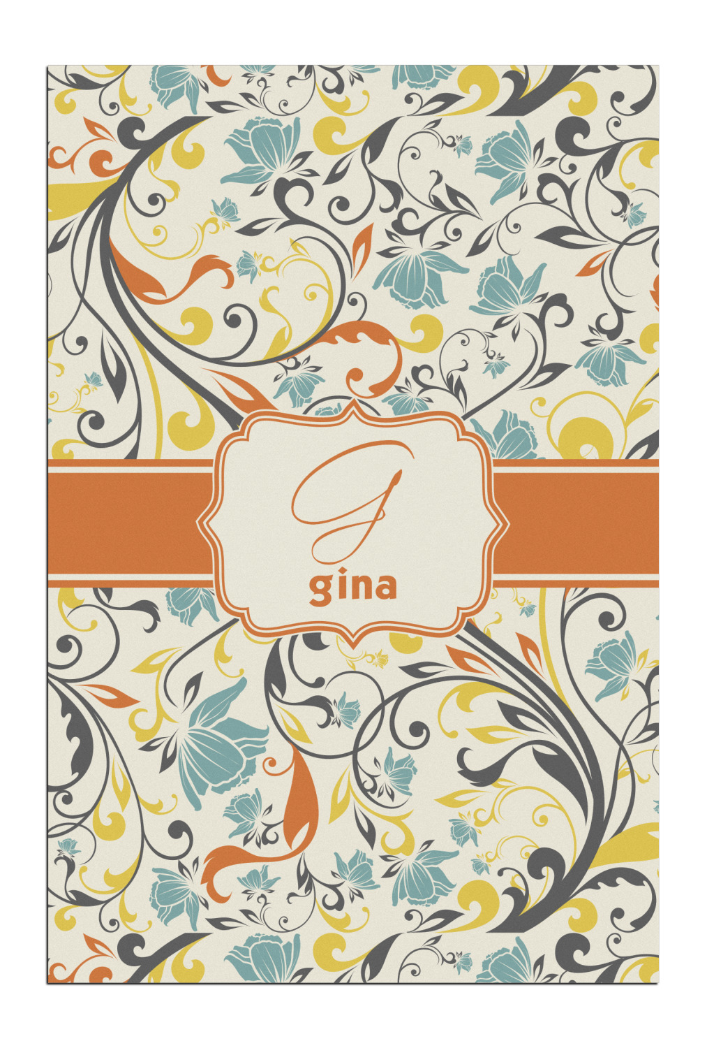The design combines green, blue, and yellow flowers with swirls of black. The floral pattern is set on a background of white to showcase the print. The design has a classic ribbon in orange trimmed in white. The decorative white label is trimmed in orange. Add an initial and a name for that personal touch to pull the entire design together.