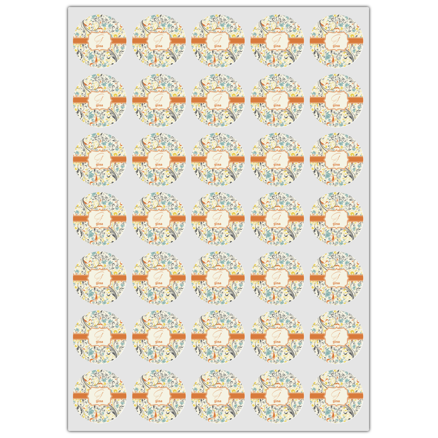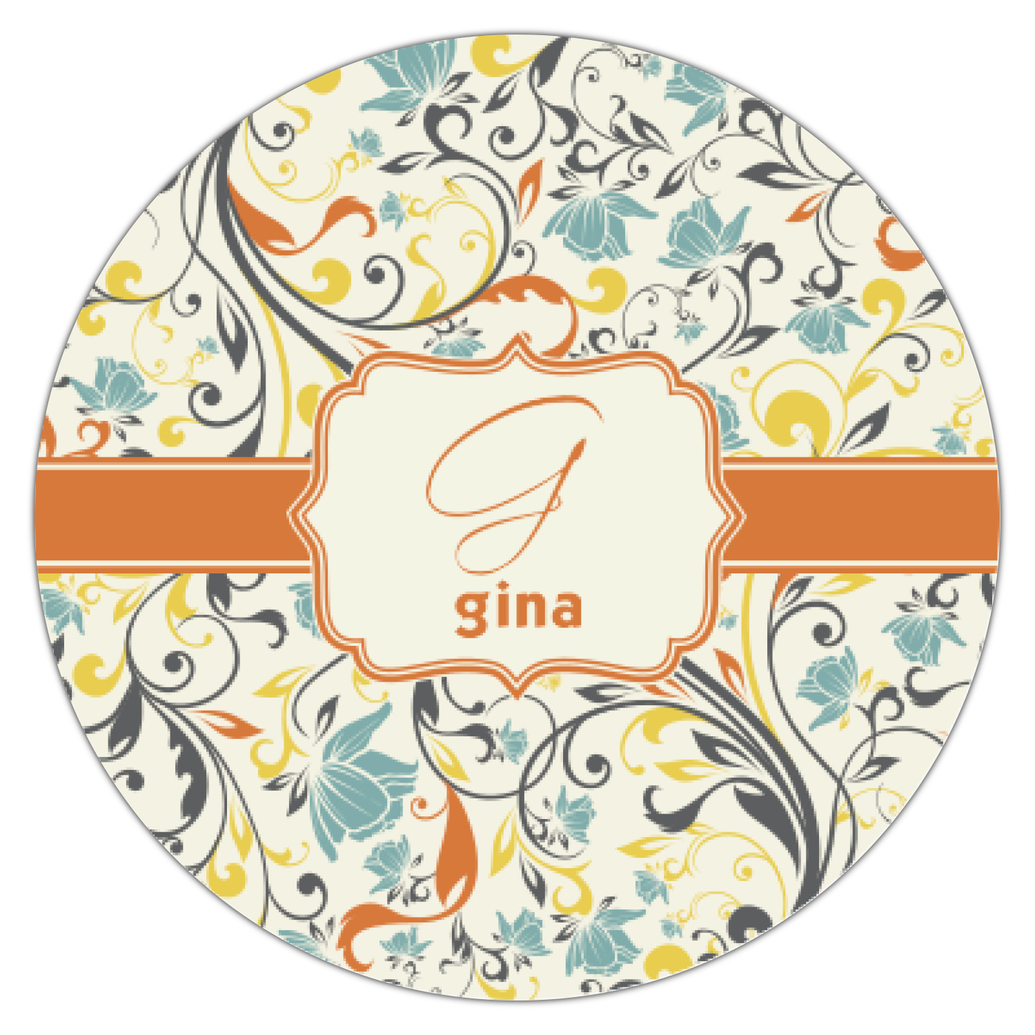 The design combines green, blue, and yellow flowers with swirls of black. The floral pattern is set on a background of white to showcase the print. The design has a classic ribbon in orange trimmed in white. The decorative white label is trimmed in orange. Add an initial and a name for that personal touch to pull the entire design together.