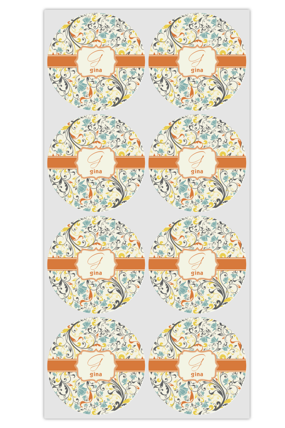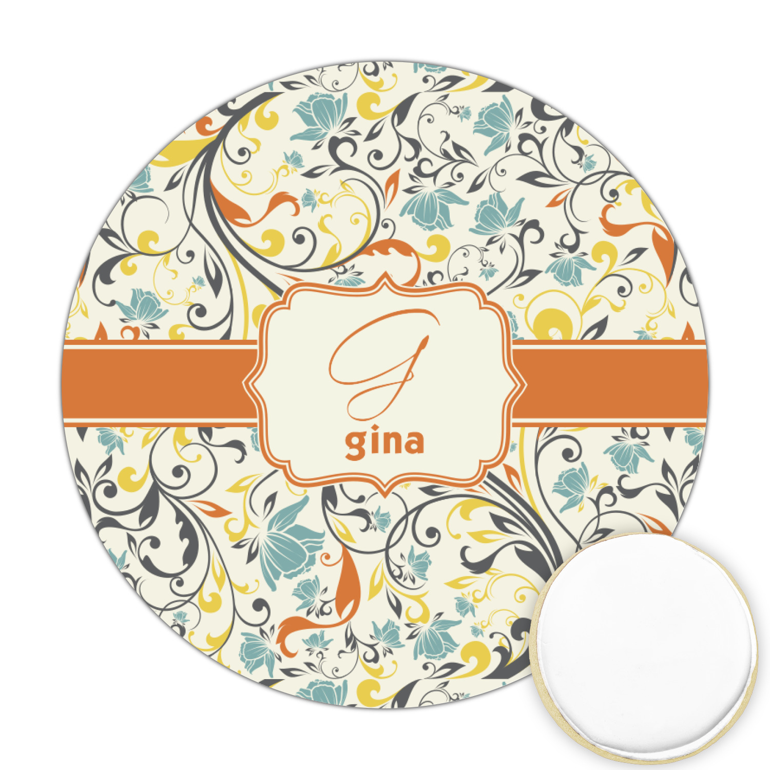 The design combines green, blue, and yellow flowers with swirls of black. The floral pattern is set on a background of white to showcase the print. The design has a classic ribbon in orange trimmed in white. The decorative white label is trimmed in orange. Add an initial and a name for that personal touch to pull the entire design together.