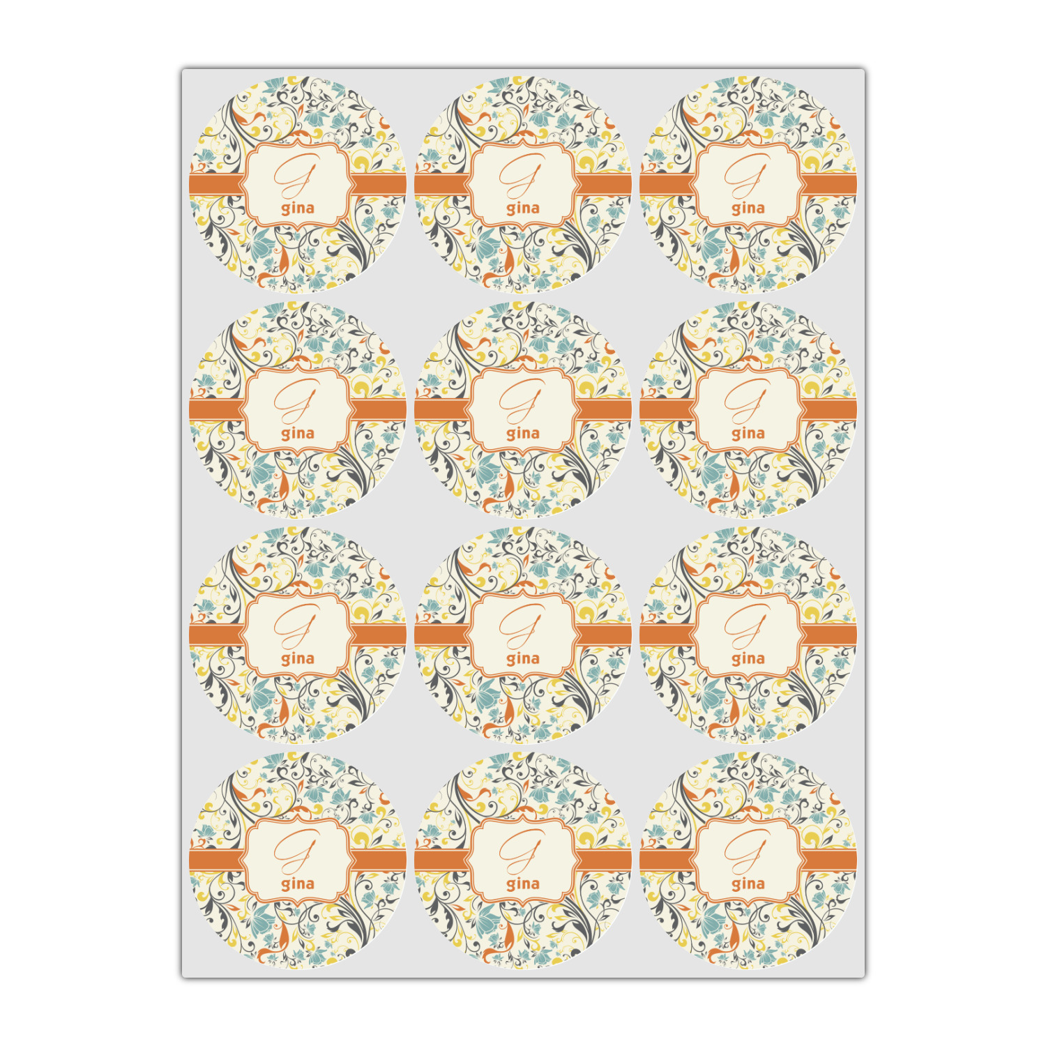 The design combines green, blue, and yellow flowers with swirls of black. The floral pattern is set on a background of white to showcase the print. The design has a classic ribbon in orange trimmed in white. The decorative white label is trimmed in orange. Add an initial and a name for that personal touch to pull the entire design together.