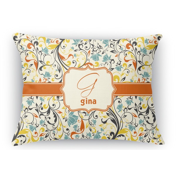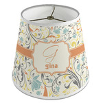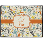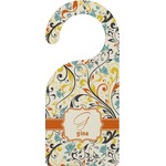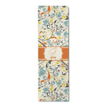The design combines green, blue, and yellow flowers with swirls of black. The floral pattern is set on a background of white to showcase the print. The design has a classic ribbon in orange trimmed in white. The decorative white label is trimmed in orange. Add an initial and a name for that personal touch to pull the entire design together.