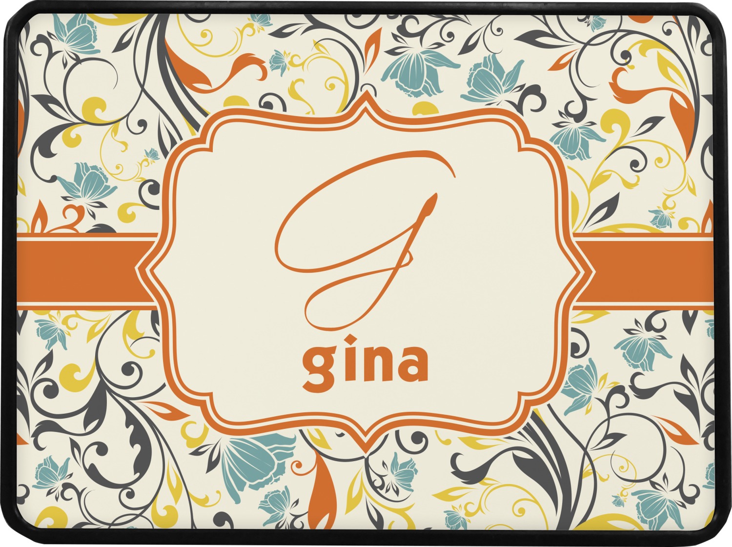 The design combines green, blue, and yellow flowers with swirls of black. The floral pattern is set on a background of white to showcase the print. The design has a classic ribbon in orange trimmed in white. The decorative white label is trimmed in orange. Add an initial and a name for that personal touch to pull the entire design together.
