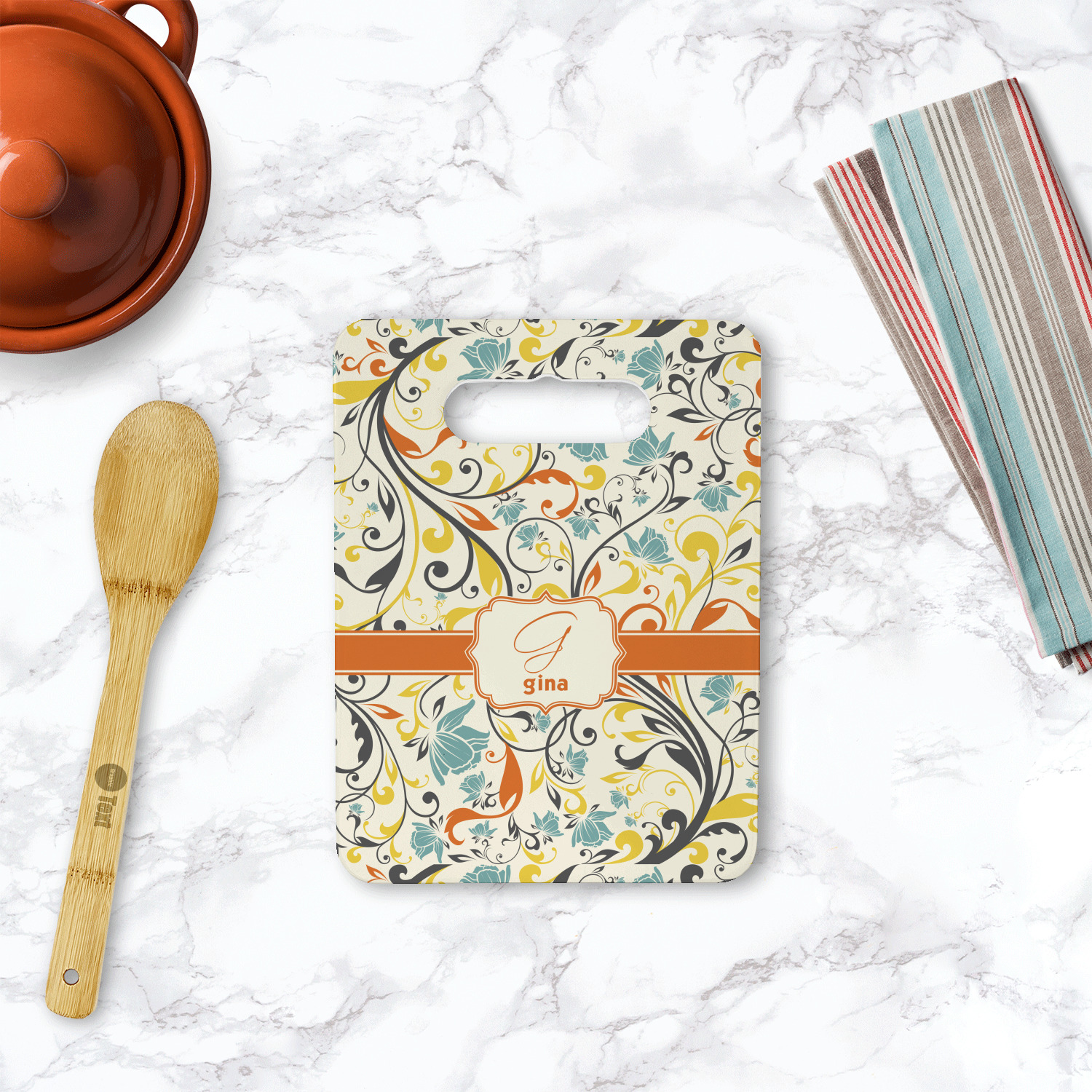 The design combines green, blue, and yellow flowers with swirls of black. The floral pattern is set on a background of white to showcase the print. The design has a classic ribbon in orange trimmed in white. The decorative white label is trimmed in orange. Add an initial and a name for that personal touch to pull the entire design together.