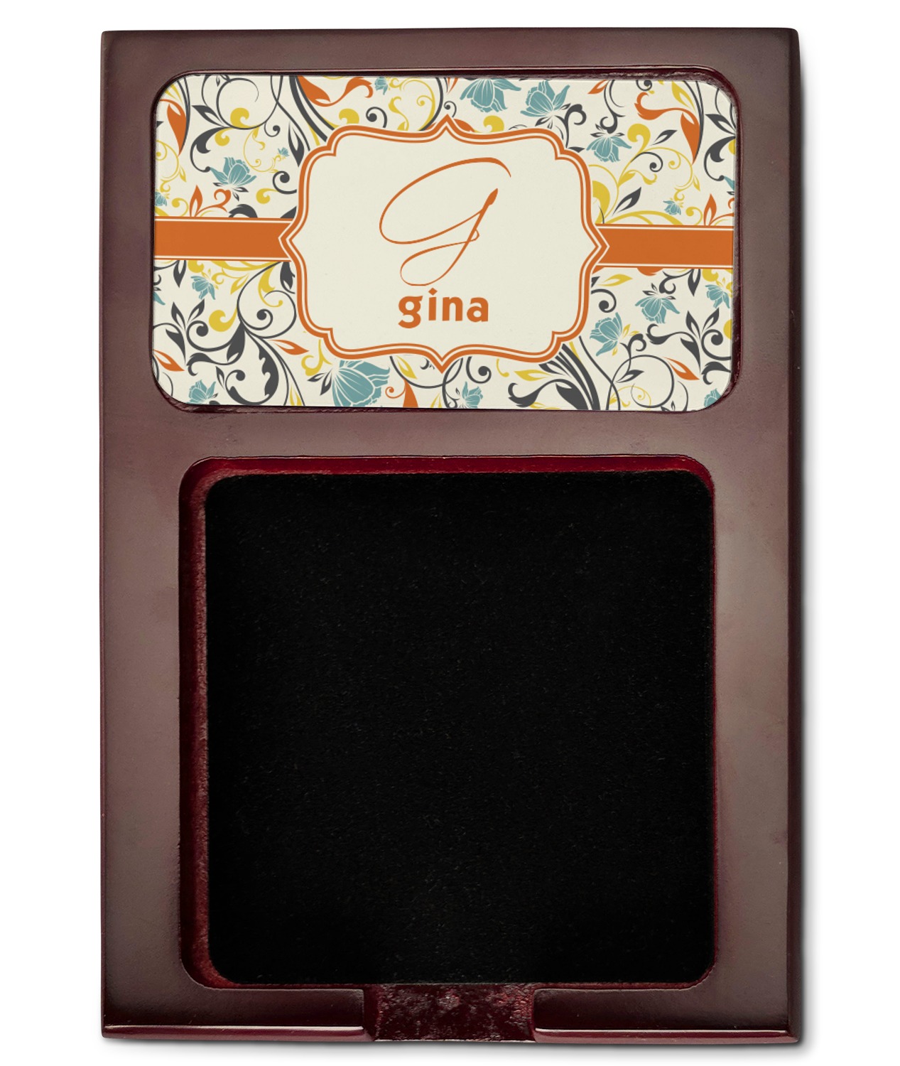 Crafted from a fine mahogany, this post it note holder is in the shade of a dark, cherry color. The dispenser itself is about 4.25 by 6.25 by 0.75 inches. You can place your 3 by 3 inch sticky notes in the indentation below the nameplate. We print your customization onto the nameplate that rests above the velvety indentation.