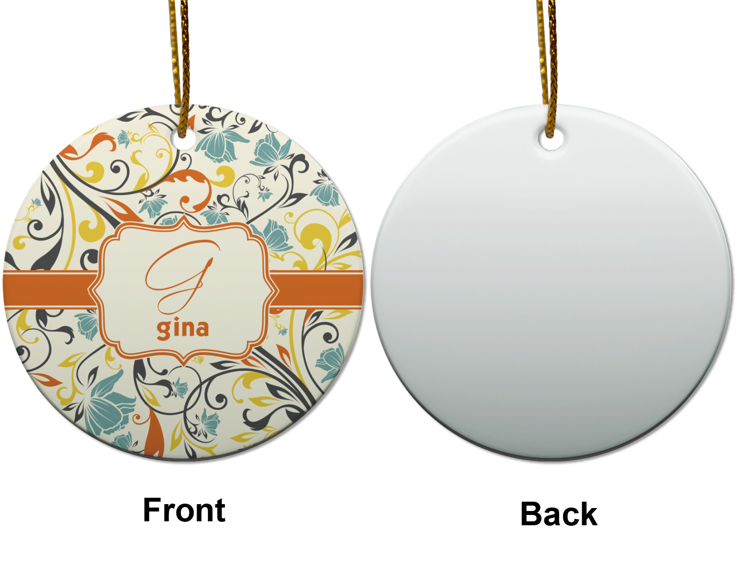 The design combines green, blue, and yellow flowers with swirls of black. The floral pattern is set on a background of white to showcase the print. The design has a classic ribbon in orange trimmed in white. The decorative white label is trimmed in orange. Add an initial and a name for that personal touch to pull the entire design together.