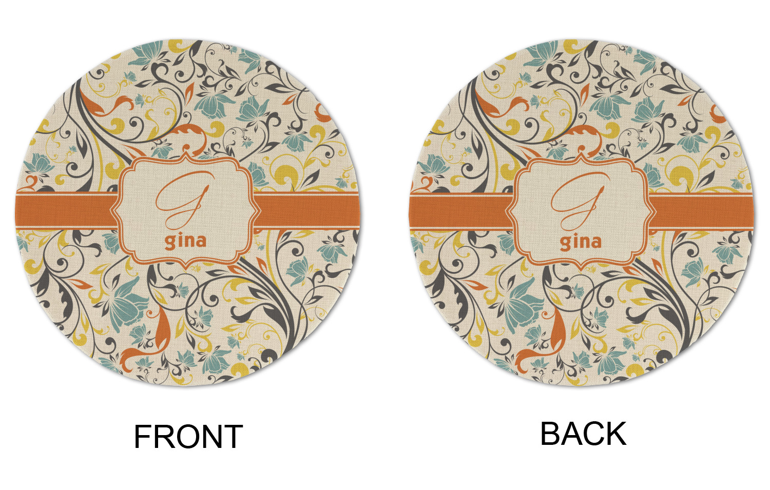 The design combines green, blue, and yellow flowers with swirls of black. The floral pattern is set on a background of white to showcase the print. The design has a classic ribbon in orange trimmed in white. The decorative white label is trimmed in orange. Add an initial and a name for that personal touch to pull the entire design together.