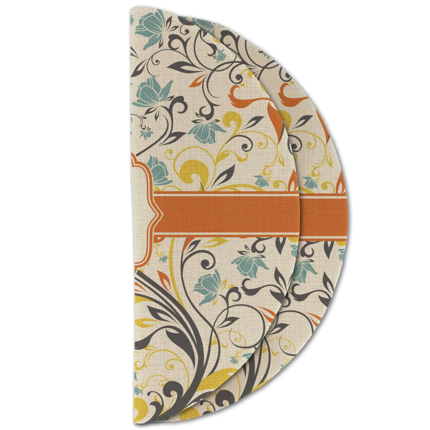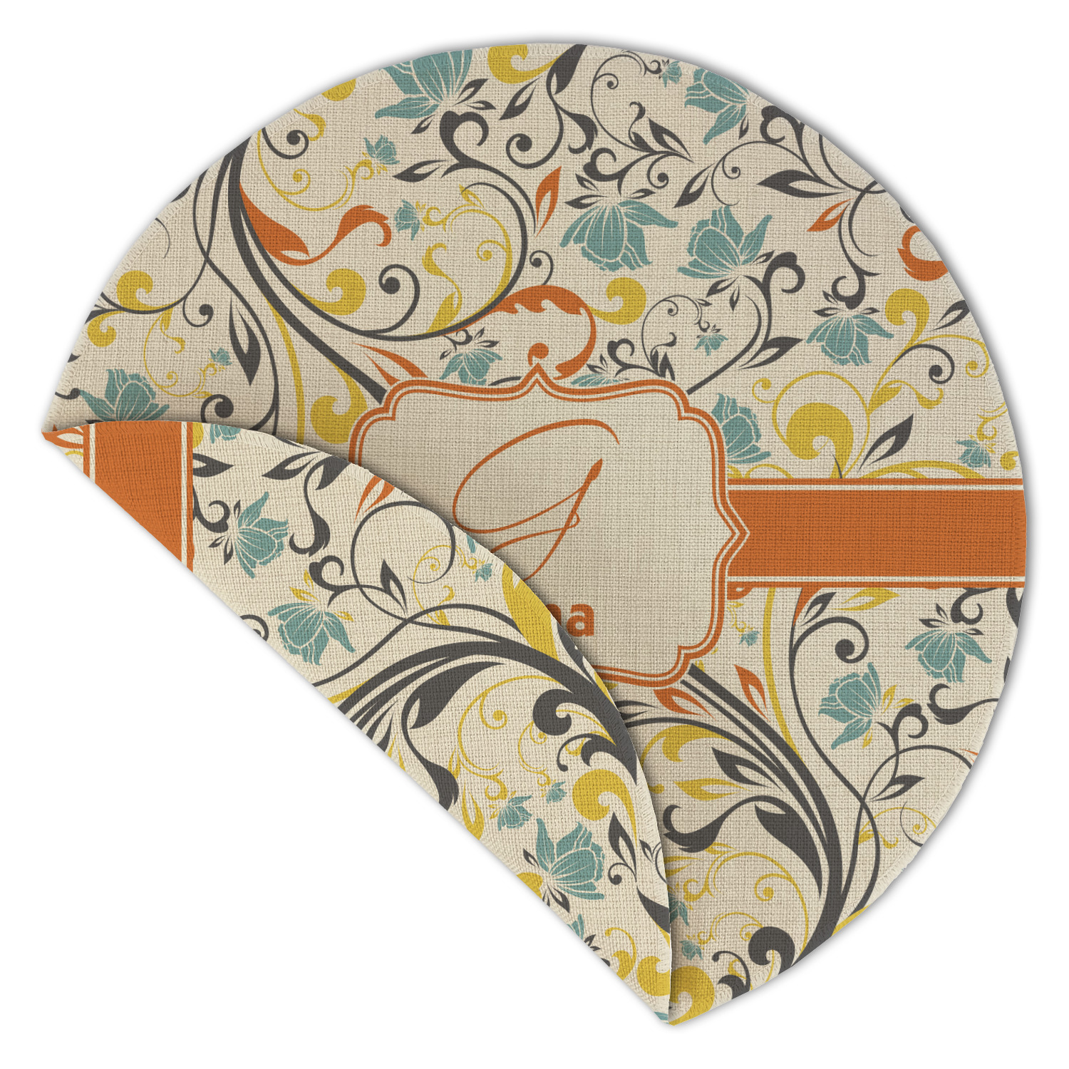 The design combines green, blue, and yellow flowers with swirls of black. The floral pattern is set on a background of white to showcase the print. The design has a classic ribbon in orange trimmed in white. The decorative white label is trimmed in orange. Add an initial and a name for that personal touch to pull the entire design together.