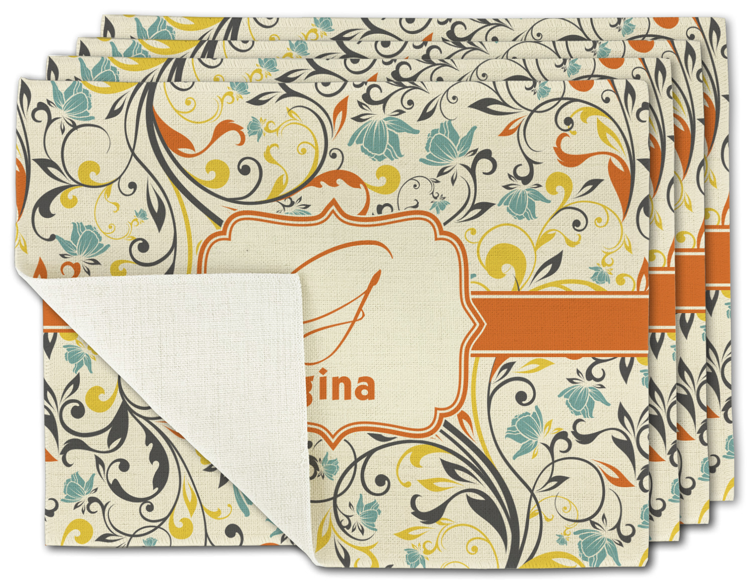 The design combines green, blue, and yellow flowers with swirls of black. The floral pattern is set on a background of white to showcase the print. The design has a classic ribbon in orange trimmed in white. The decorative white label is trimmed in orange. Add an initial and a name for that personal touch to pull the entire design together.