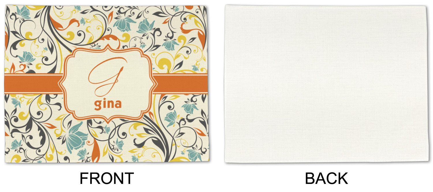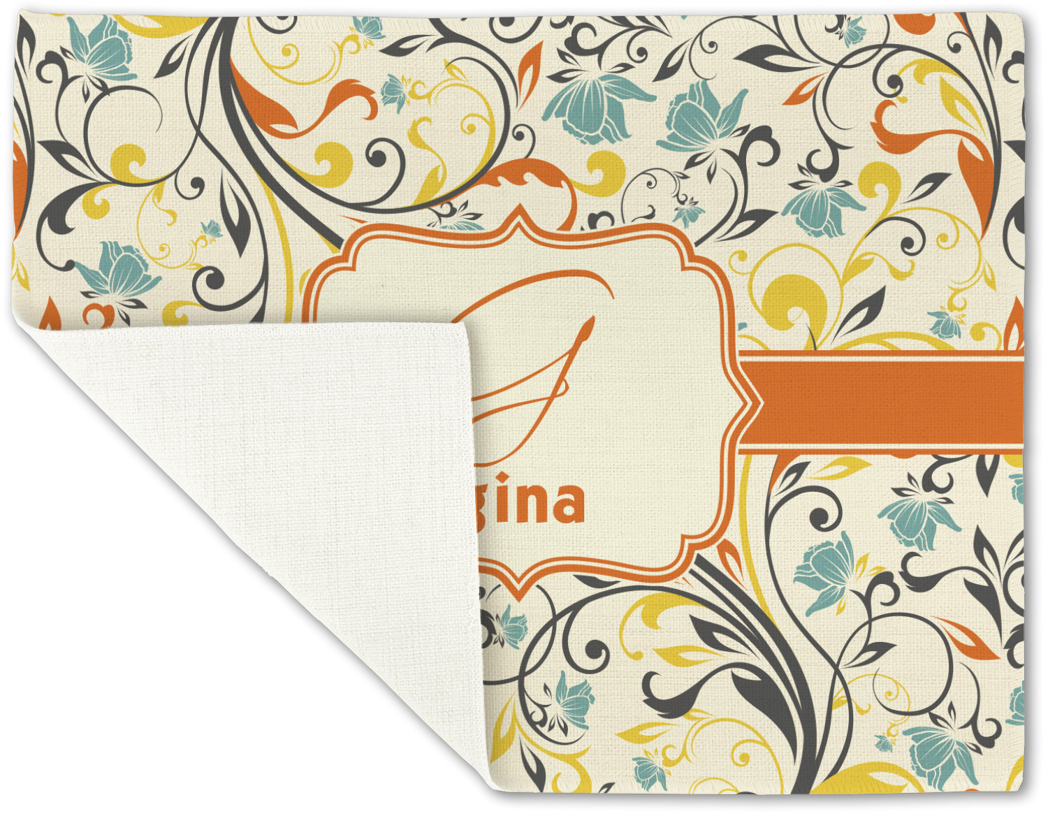 The design combines green, blue, and yellow flowers with swirls of black. The floral pattern is set on a background of white to showcase the print. The design has a classic ribbon in orange trimmed in white. The decorative white label is trimmed in orange. Add an initial and a name for that personal touch to pull the entire design together.