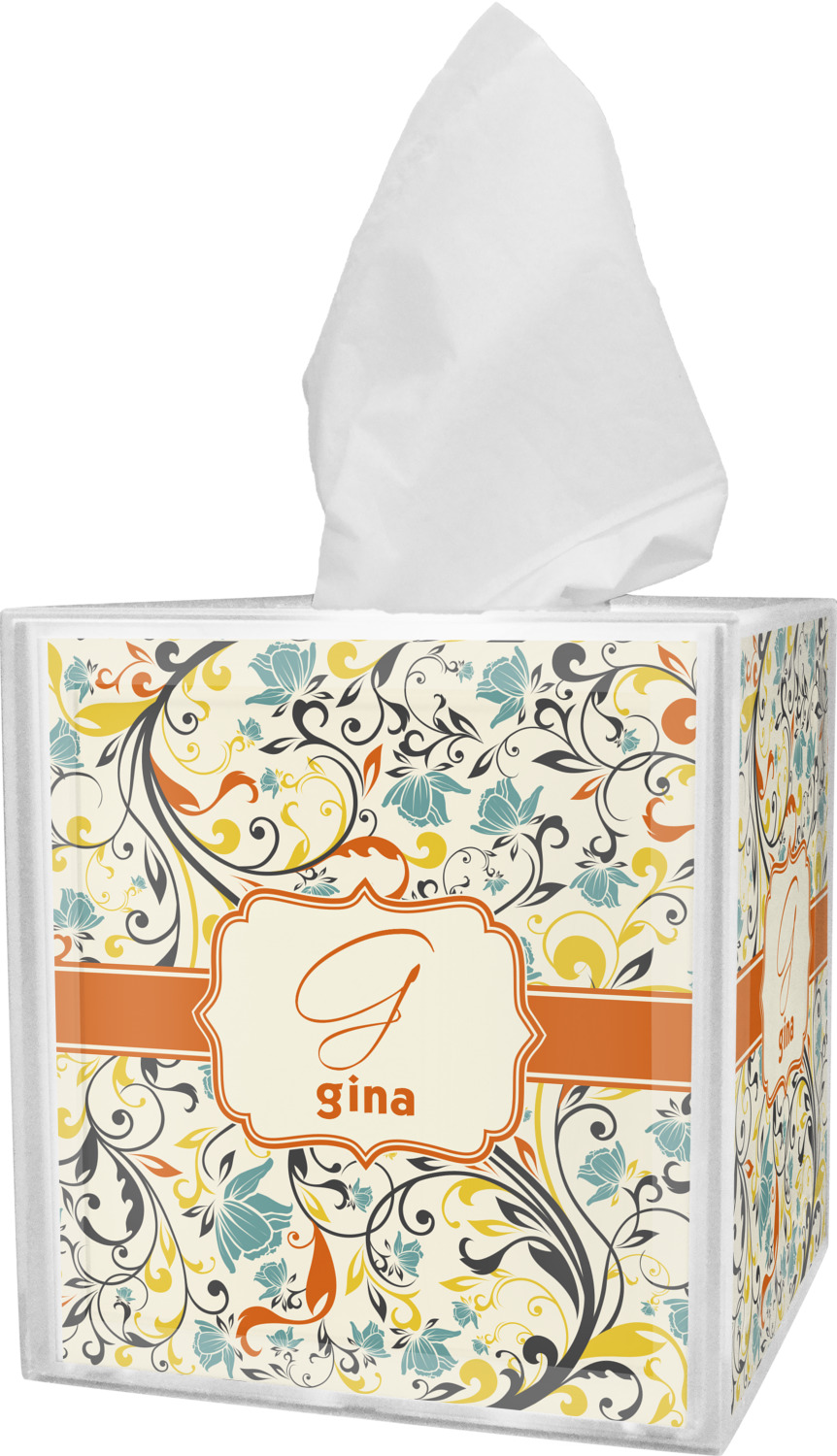 These tissue holders are built from durable acrylic and display your unique personalization on fine-quality vinyl inserts placed within the four sides and top. The box features two pieces, allowing you to easily switch out tissue boxes. On the sides, youll find ridges that ensure the top and base fit securely in place. The bottom of these tissue box holders has four, rubber, non-slip pads to prevent the box from scuffing any surface you decide to display it on. Each box can fit a standard 5 by 5-inch box of tissues.