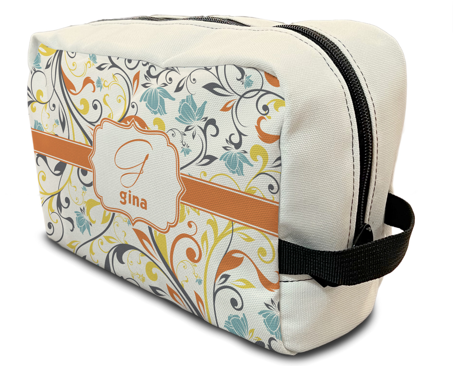 Our toiletry bag has the traditional dopp kit design i.e. a side to side zippered closure, giving you easy access to all the contents inside and a sturdy handle on one side of the bag. The canvas fabric for dopp kits is printed, then cut and sewn here in the USA.