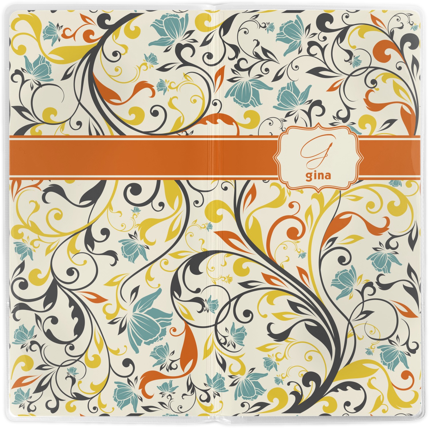 The design combines green, blue, and yellow flowers with swirls of black. The floral pattern is set on a background of white to showcase the print. The design has a classic ribbon in orange trimmed in white. The decorative white label is trimmed in orange. Add an initial and a name for that personal touch to pull the entire design together.