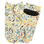 The design combines green, blue, and yellow flowers with swirls of black. The floral pattern is set on a background of white to showcase the print. The design has a classic ribbon in orange trimmed in white. The decorative white label is trimmed in orange. Add an initial and a name for that personal touch to pull the entire design together.