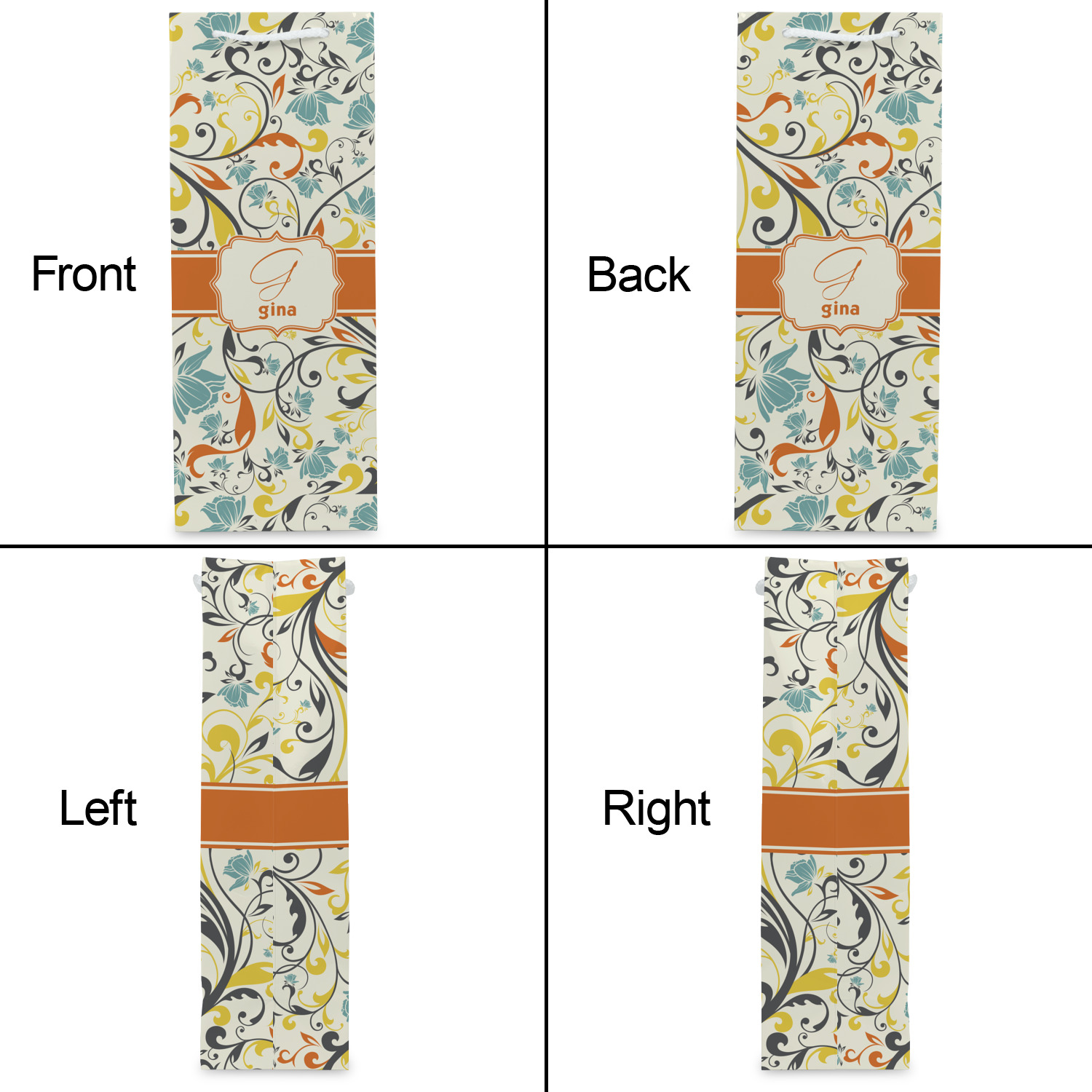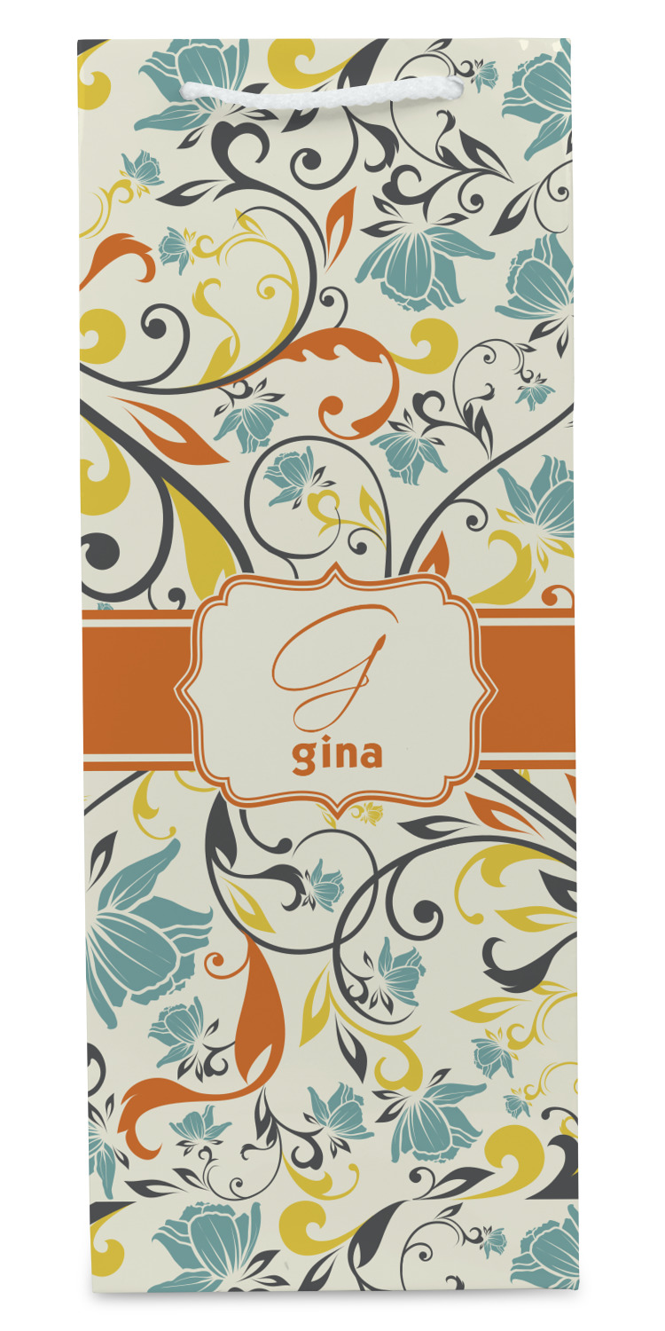 The design combines green, blue, and yellow flowers with swirls of black. The floral pattern is set on a background of white to showcase the print. The design has a classic ribbon in orange trimmed in white. The decorative white label is trimmed in orange. Add an initial and a name for that personal touch to pull the entire design together.