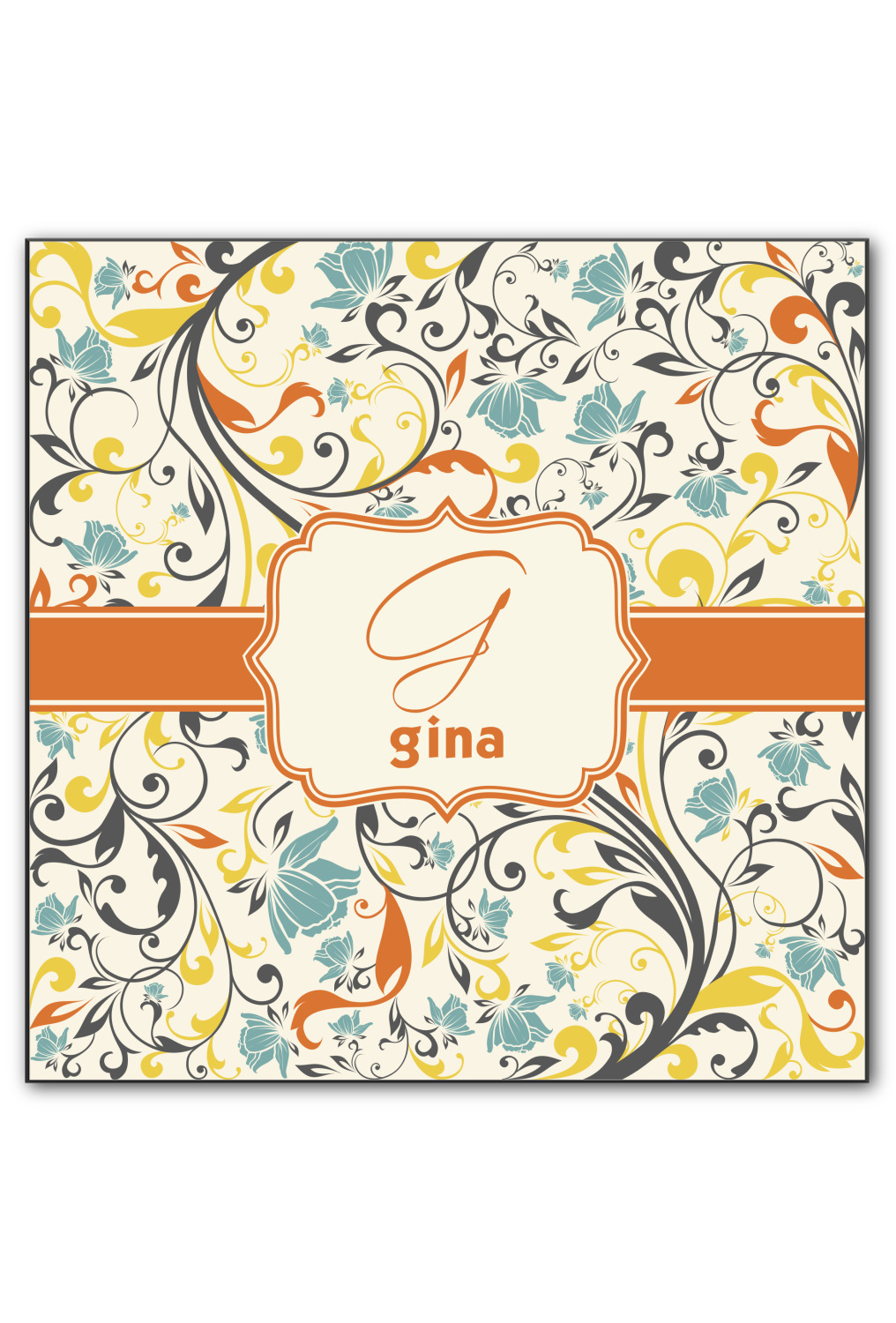 The design combines green, blue, and yellow flowers with swirls of black. The floral pattern is set on a background of white to showcase the print. The design has a classic ribbon in orange trimmed in white. The decorative white label is trimmed in orange. Add an initial and a name for that personal touch to pull the entire design together.