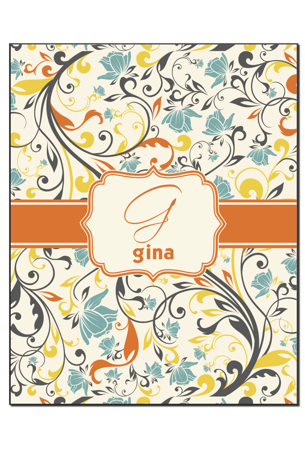 The design combines green, blue, and yellow flowers with swirls of black. The floral pattern is set on a background of white to showcase the print. The design has a classic ribbon in orange trimmed in white. The decorative white label is trimmed in orange. Add an initial and a name for that personal touch to pull the entire design together.