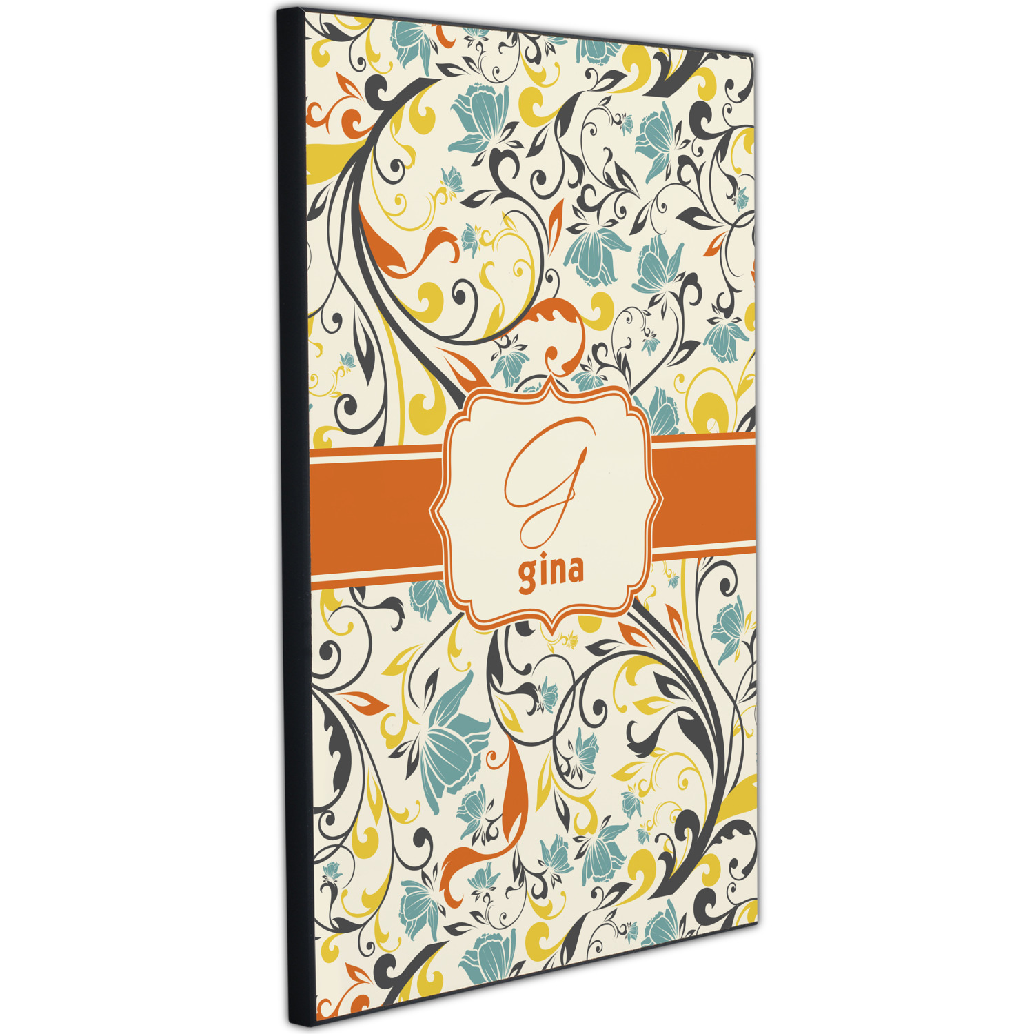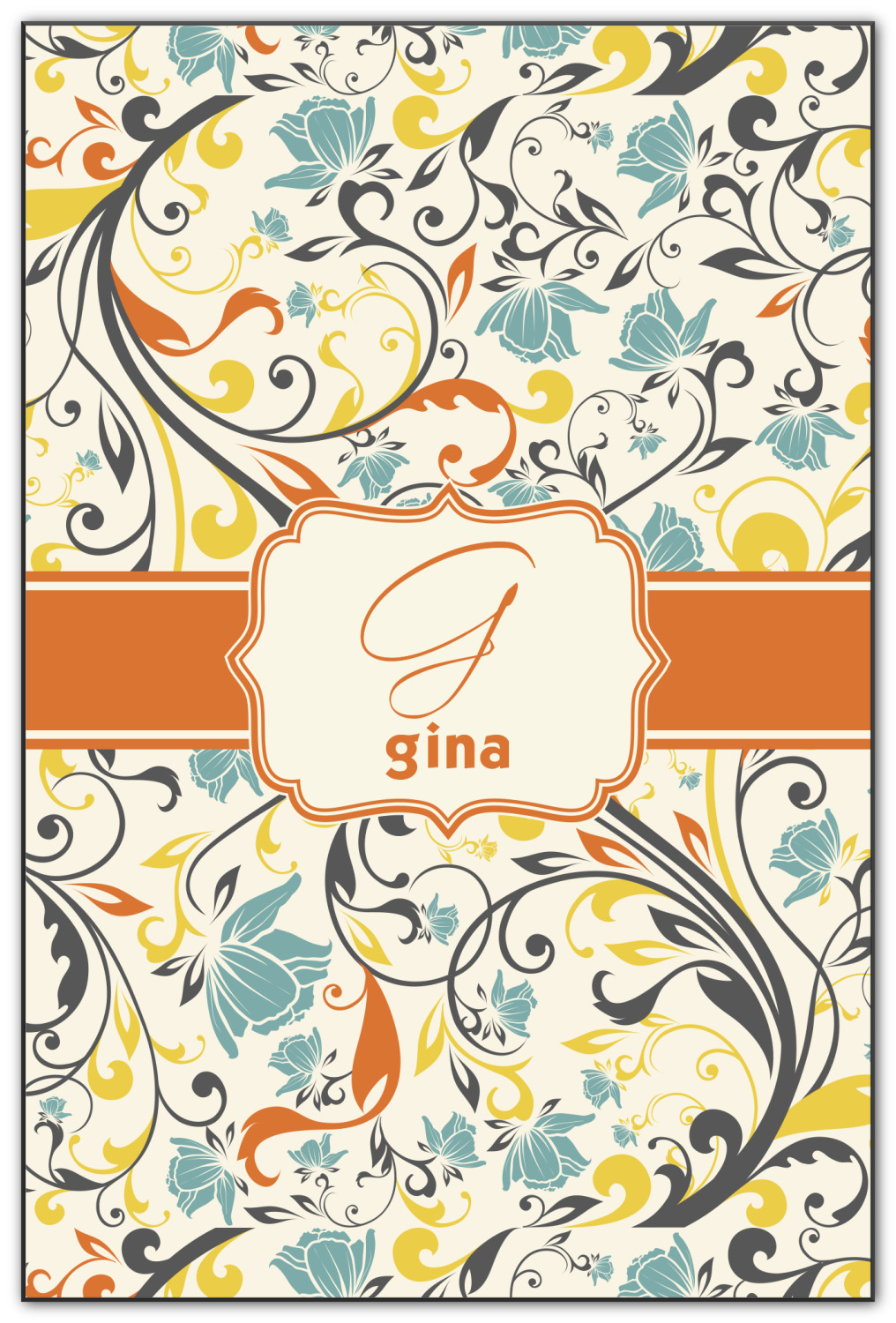 The design combines green, blue, and yellow flowers with swirls of black. The floral pattern is set on a background of white to showcase the print. The design has a classic ribbon in orange trimmed in white. The decorative white label is trimmed in orange. Add an initial and a name for that personal touch to pull the entire design together.