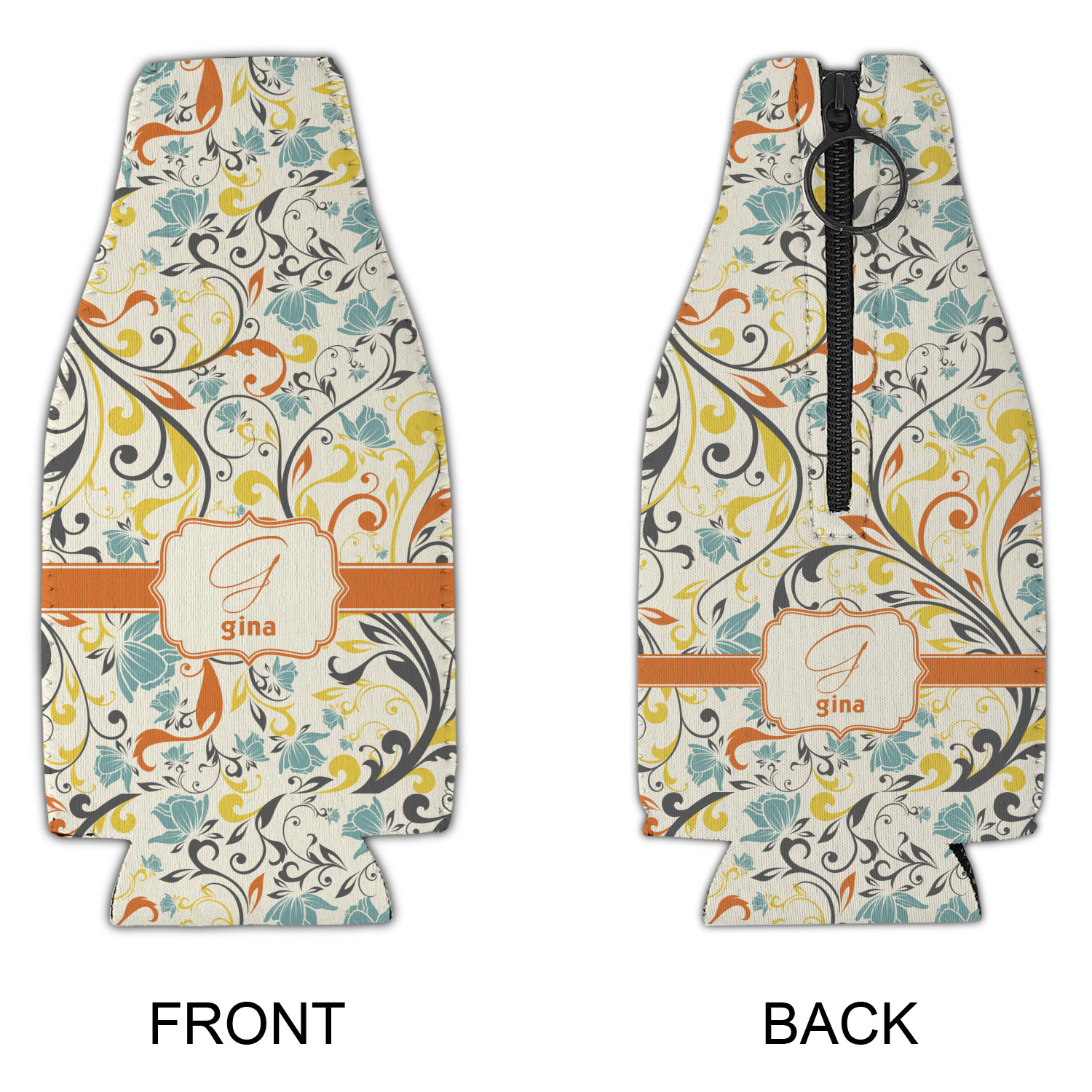 The design combines green, blue, and yellow flowers with swirls of black. The floral pattern is set on a background of white to showcase the print. The design has a classic ribbon in orange trimmed in white. The decorative white label is trimmed in orange. Add an initial and a name for that personal touch to pull the entire design together.