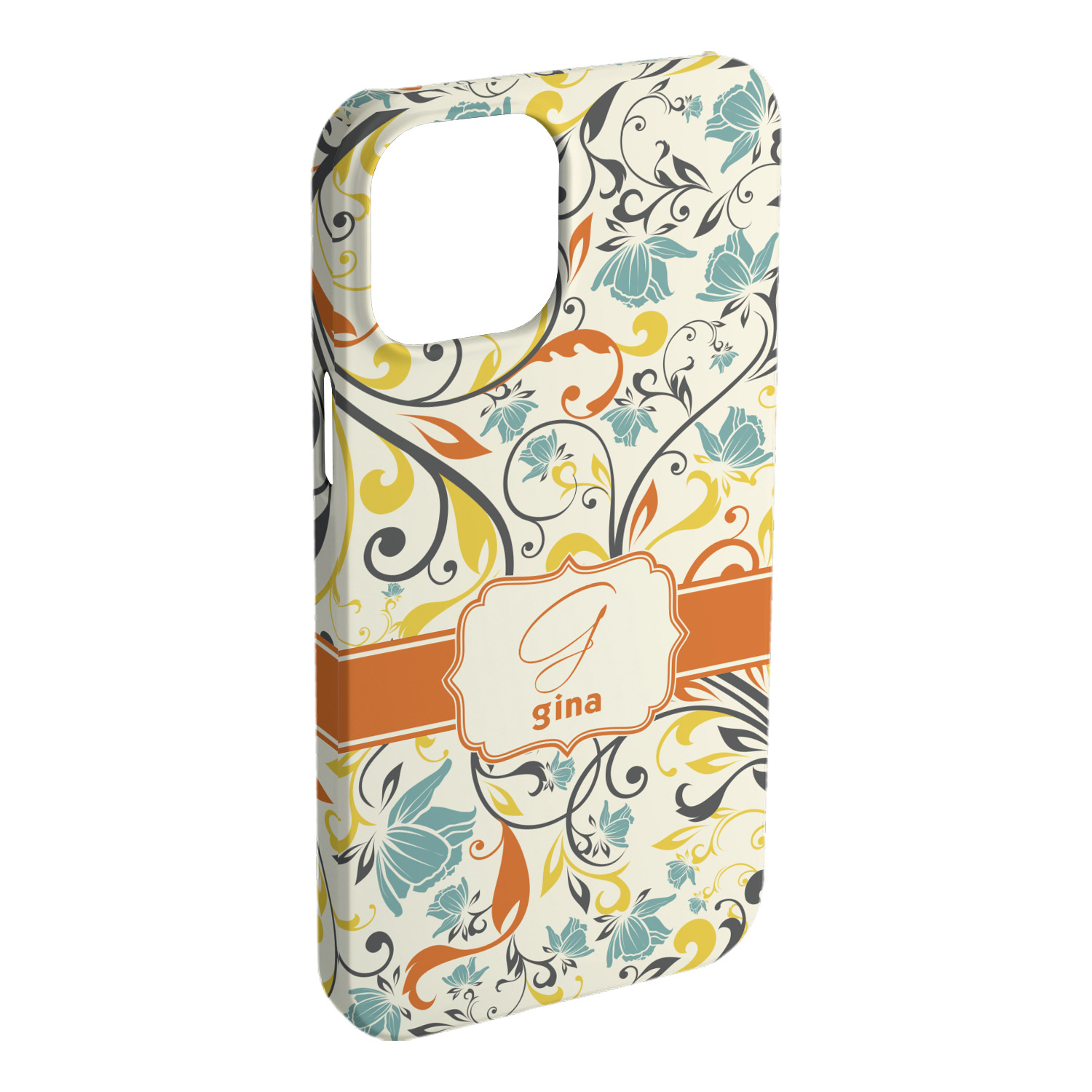 The design combines green, blue, and yellow flowers with swirls of black. The floral pattern is set on a background of white to showcase the print. The design has a classic ribbon in orange trimmed in white. The decorative white label is trimmed in orange. Add an initial and a name for that personal touch to pull the entire design together.