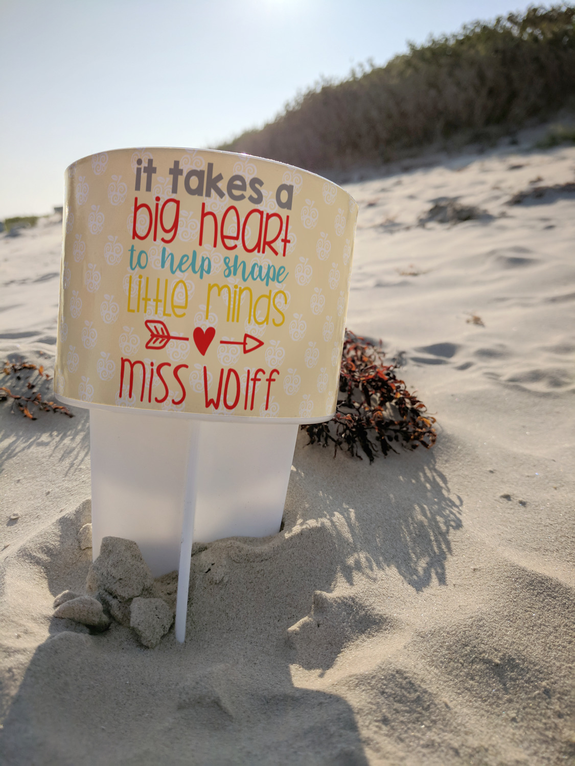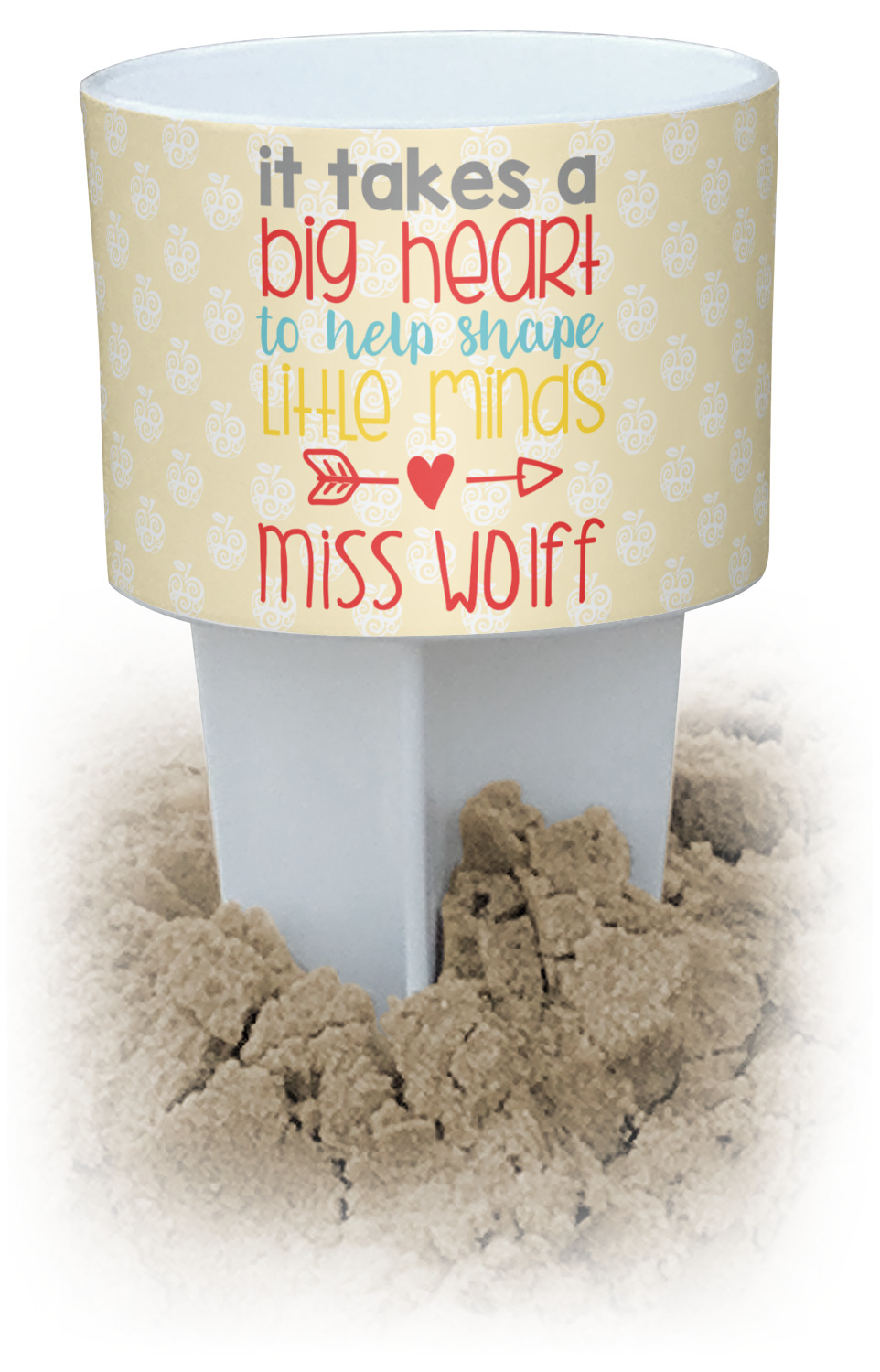This cup holder has a large stake at its bottom that anchors it to the sand or ground below, while the cup holder rests above the stake. The entire drink holder is made of durable plastic and displays your customization around the cup holder portion. We sell these personalized beach spikers in two different colors: black and white.