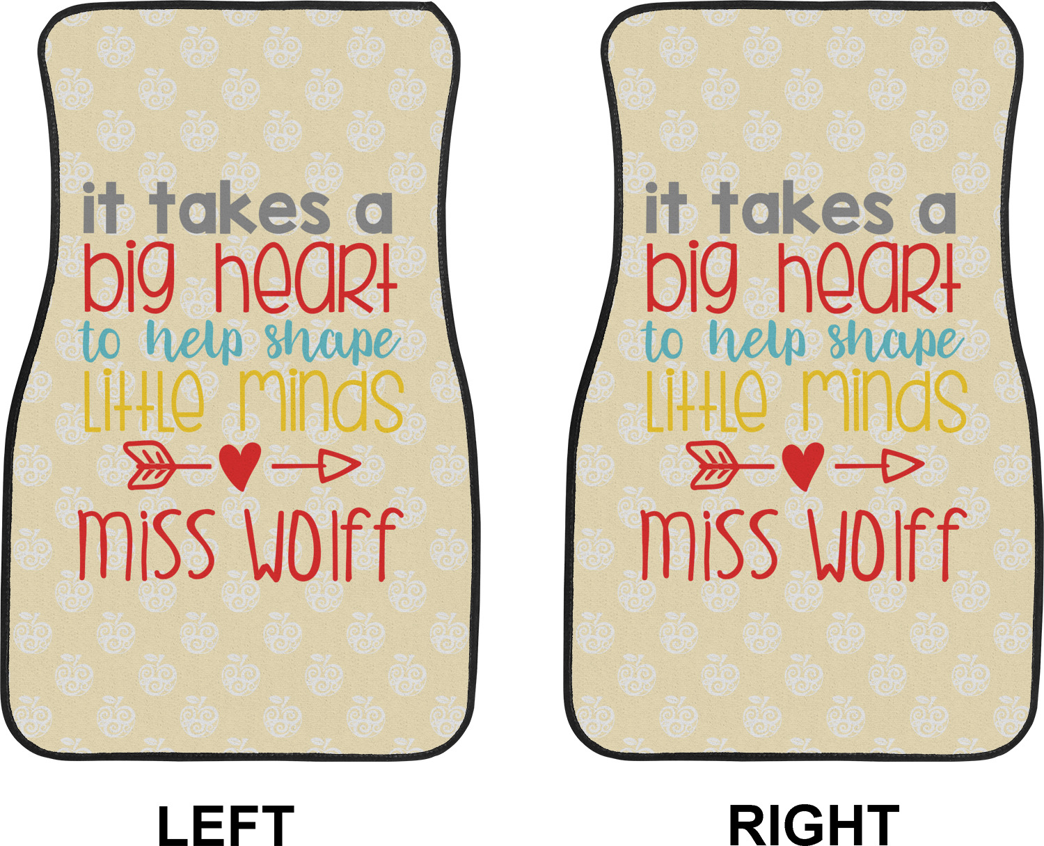 We craft our auto floor mats mats from polyester, apply a black finish to the edges, and lined at the bottom to prevent slippage. These mats protect your floors from grass, mud, and any accidental spills. We display your personalized design on the front face of each mat. The sizes of these car floor liners are standardized to provide a versatile fit for all vehicles. The front rows car mats measure at 17 by 26.5 inches, while the back rows measure at 17 by 13 inches. We sell three packages of car floor mats. You can purchase a pair of front row car mats, a pair of back row car mats, or a set of front row and back row car mats. To make an informed purchase, we recommend measuring the surface area of your car floors.