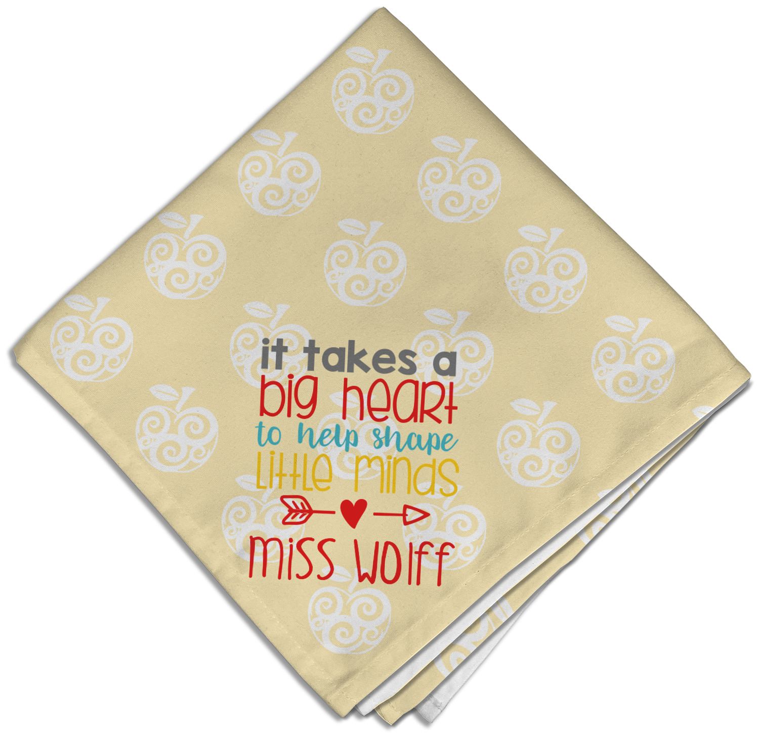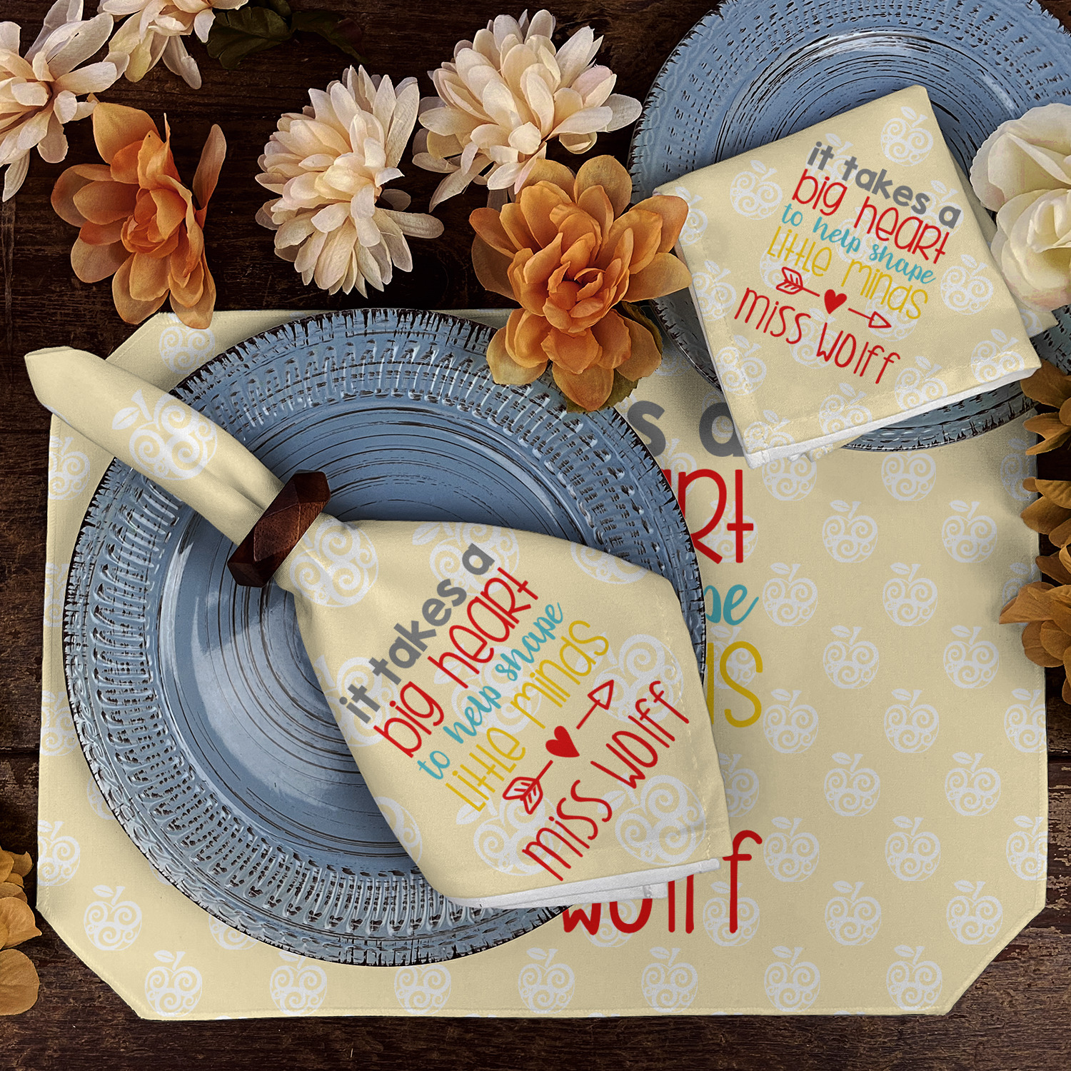 Each customizable cloth napkin is a polyester material guaranteed for long-term use. Since our napkins are cloth, it serves as a great reusable and eco-friendly dining decor. We sell personalized napkins individually or as a set of 4! Print your own unique design on all four napkins, or create four individual designs for each napkin! We offer two different napkin sizes - Cocktail napkins (approx. 10 x 10) and Dinner napkins (approx. 20 x 20). We print your design on one side, perfect for displaying your custom designed lunch napkins in any fold or table setting!