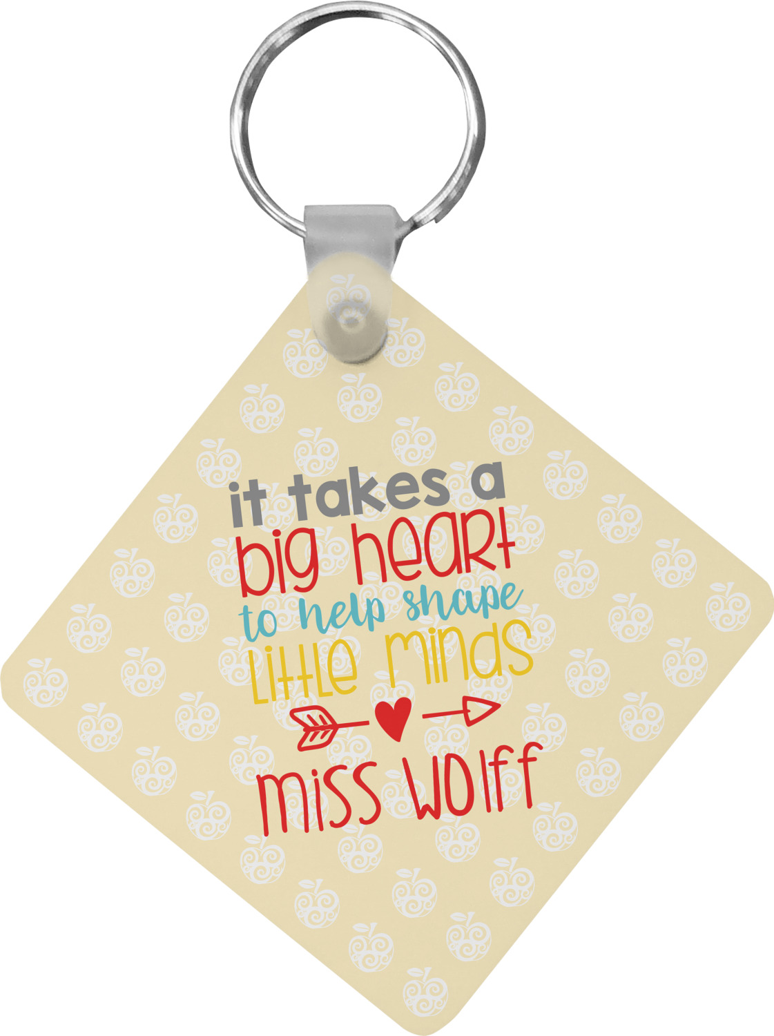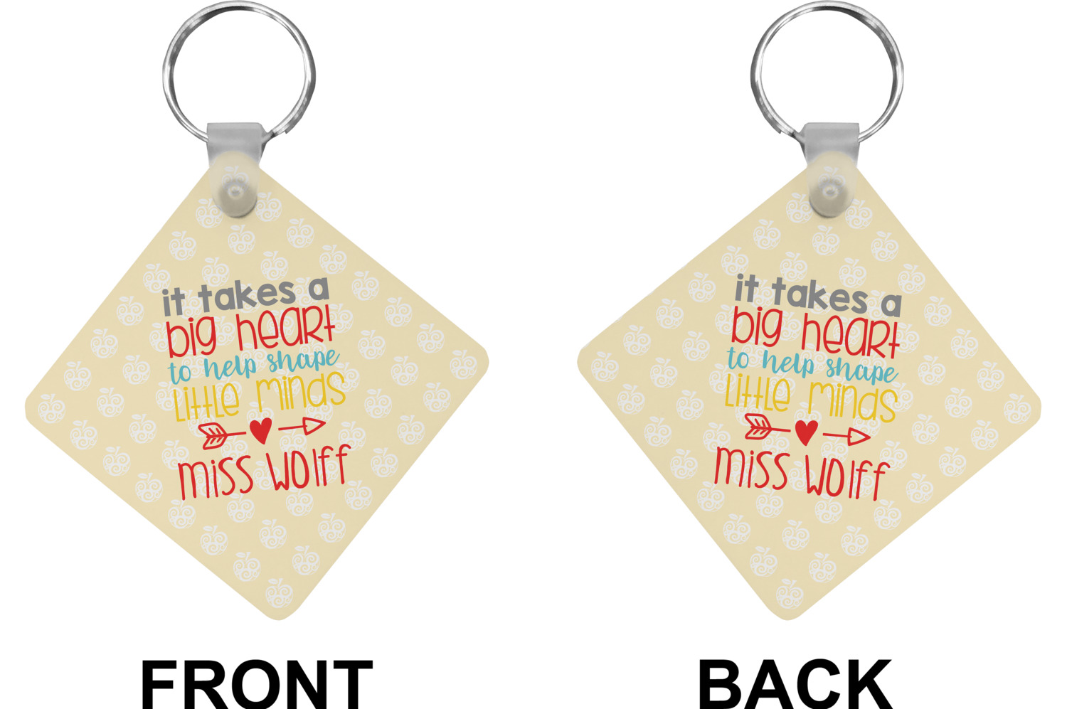 Our personalized keychains attach to the included metal, split key ring with a plastic, removable snap. Since a metal ring is included with your purchase, you have the liberty to keep your keys together on the ring, with or without your unique keychain. We offer this keychain in three different shapes: circle, heart, or diamond. We print your personalized design(s) on both sides of the key chain, and the surface has a glossy, reflective finish that only emphasizes your design. Each keychain is approximately 2.25 by 2.25 inches.