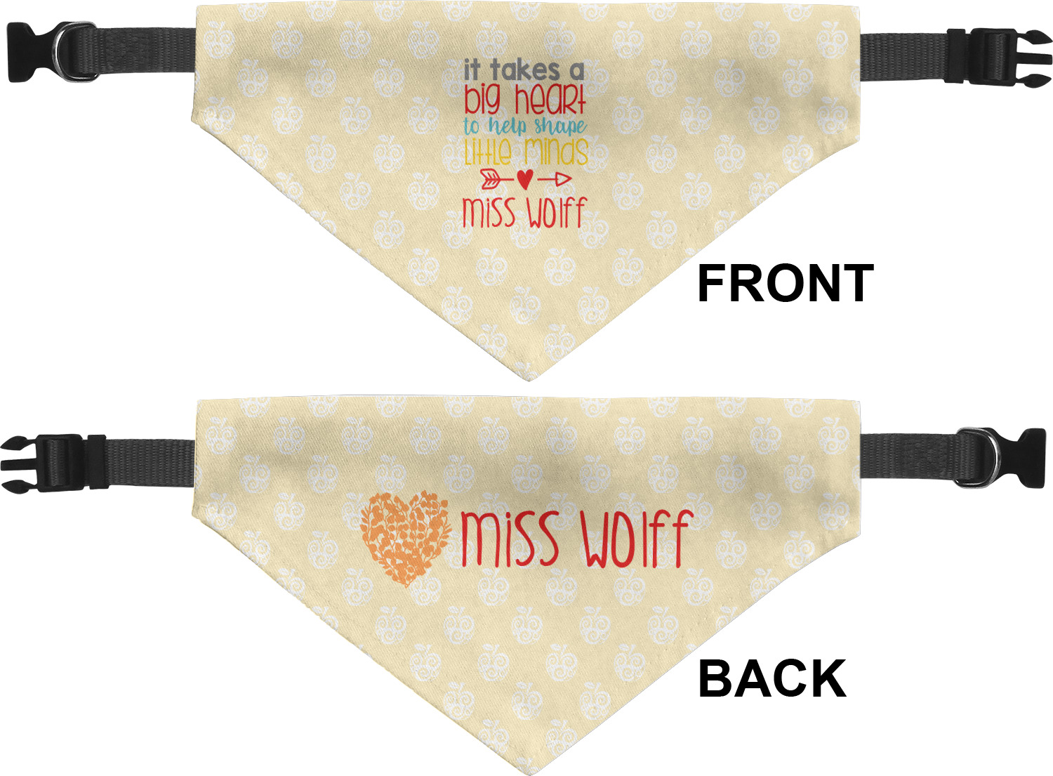 We print the front and back of these dog bandanas with your customized design. The bandana itself is made from a durable polyester, sewn together with a gap large enough to accommodate any collar. Regardless, the bandana includes a plain black, canvas collar with plastic snaps, that can easily be removed if desired. These dog bandana collars are available in four sizes: small, medium, large, and extra large. Please see our sizing chart for more information regarding the dimensions of each size.