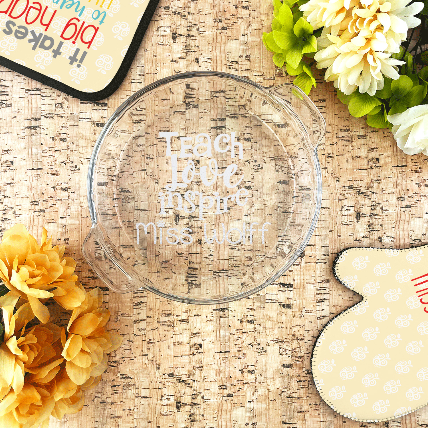 Use our design studio to design your very own pie plate which we will then laser engrave onto the bottom of the pie plate for you. Next time you take this pie plate to a pot luck no-one else will be able to claim it as theirs when its customized just for you!
