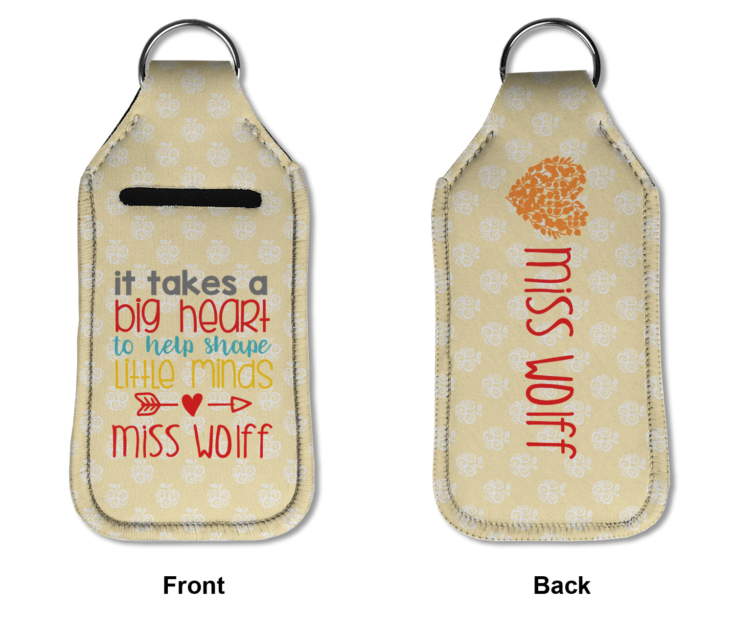 Each hand sanitizer holder comes with its own empty travel-sized, refillable hand sanitizer sure to fit snug in your customized sanitizer case! Our hand sanitizer cases are a durable, yet soft neoprene material sure to last any daily activities or travel agenda. Customize and personalize a hand sanitizer bottle holder with one of our two sizes - small (4.25" x 2.25") or large (5.5" x 2.5"). Each travel sanitizer holder comes with a keyring for attachment on bags, keys, or more!