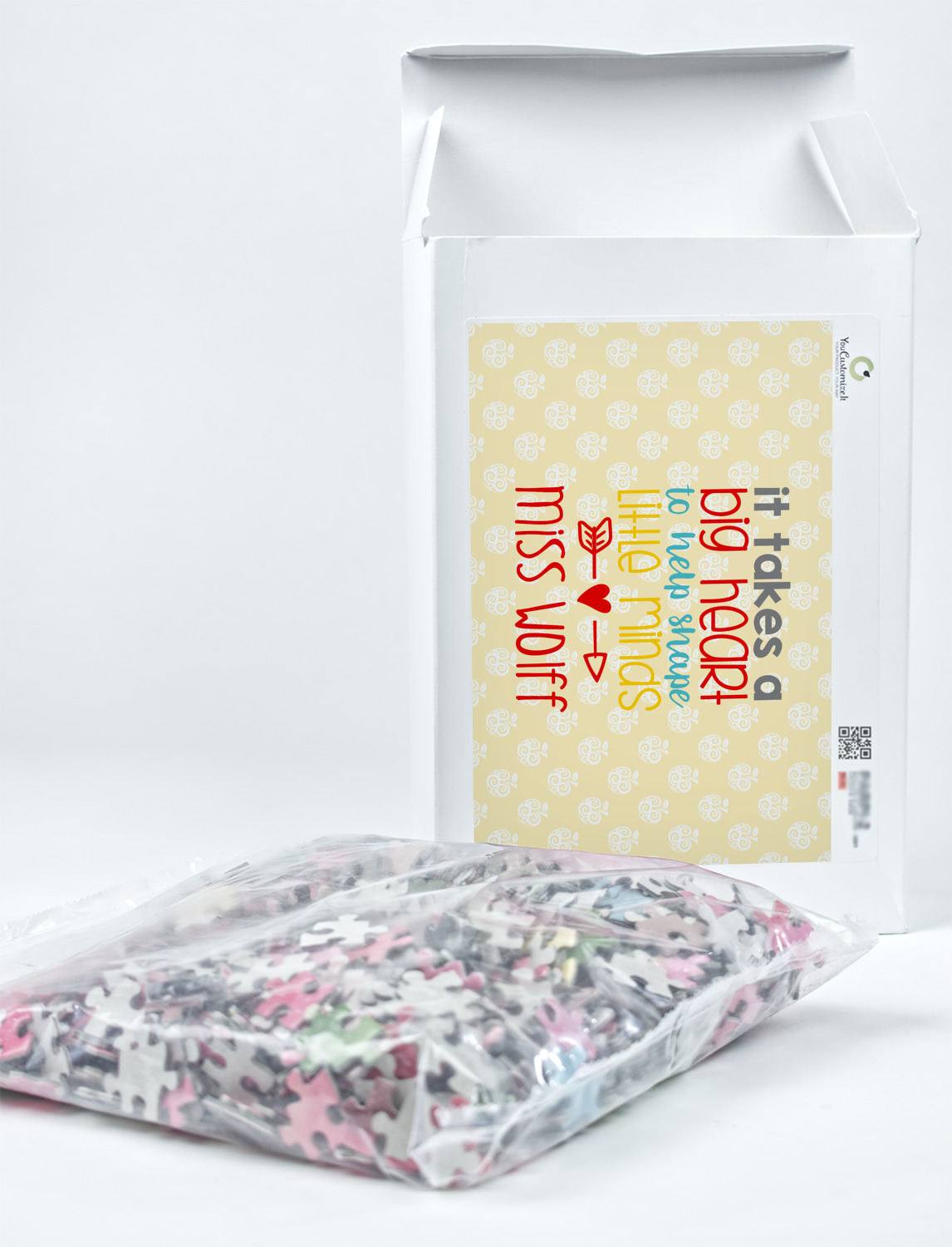 You can also upload your logo or art that you or your kids drew. To create more challenging jigsaw puzzles, you can create a pattern from with your logo or artwork. You can also add other elements such as text or personalization.