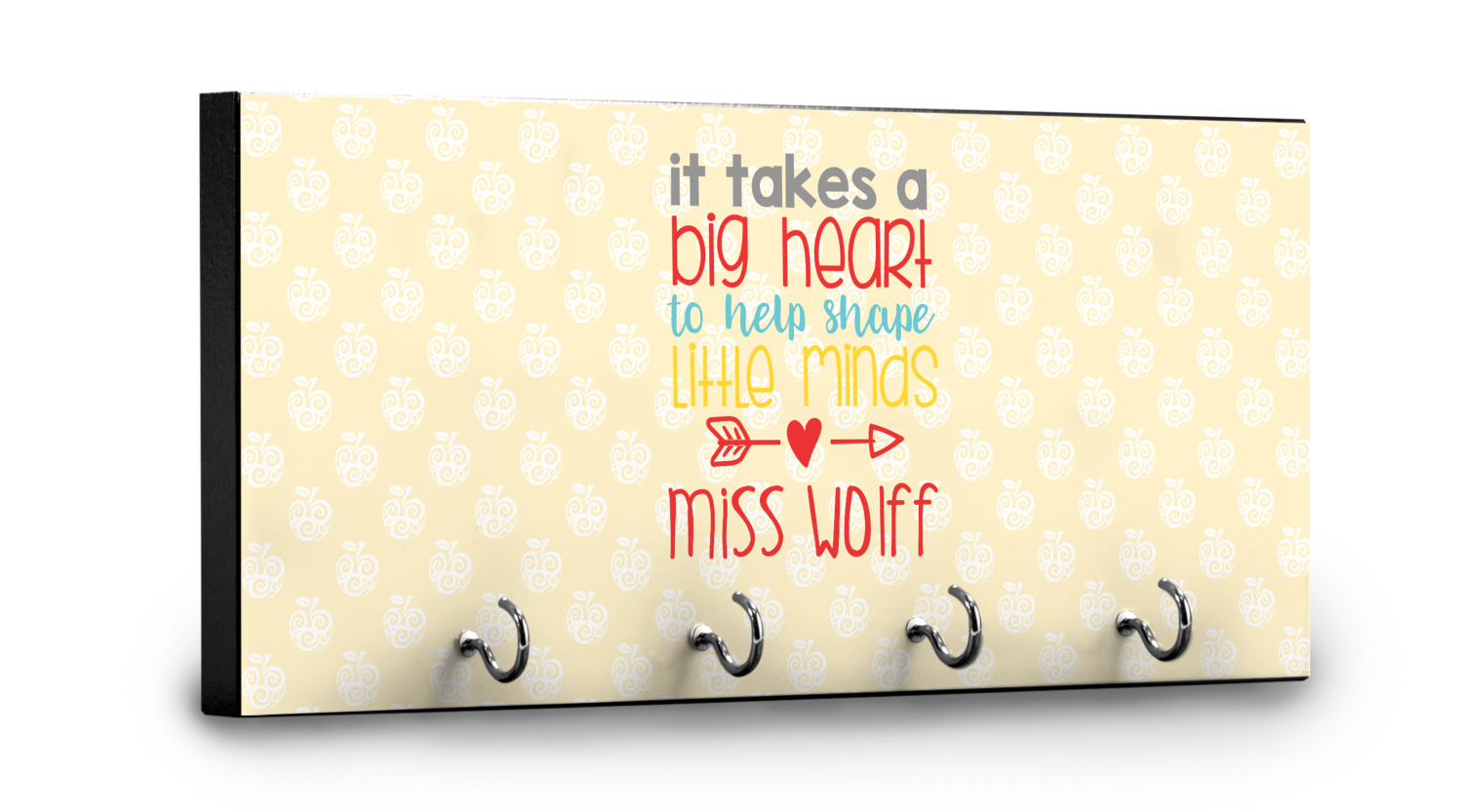 This 11" x 5" key hanger is made of sturdy wood and has four metal hooks lining the bottom. This is the perfect size for a family with several drivers. Not only can you hang keys on it though, but pet leashes and other small items. The board is black on the sides and back and is printed with the design of your choice on the front.