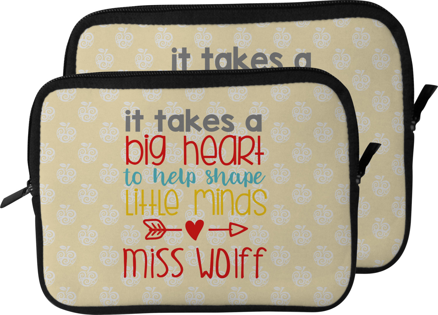 These laptop covers are built from a water-resistant, cushioned neoprene. We display your personalized design on the front of this computer sleeve, while the other sides are simply the black color of the neoprene fabric. A zipper lines the top half of this case, for direct access to your device. For added protection, the interior of this neoprene laptop sleeve is lined with a padded, minky-like material.