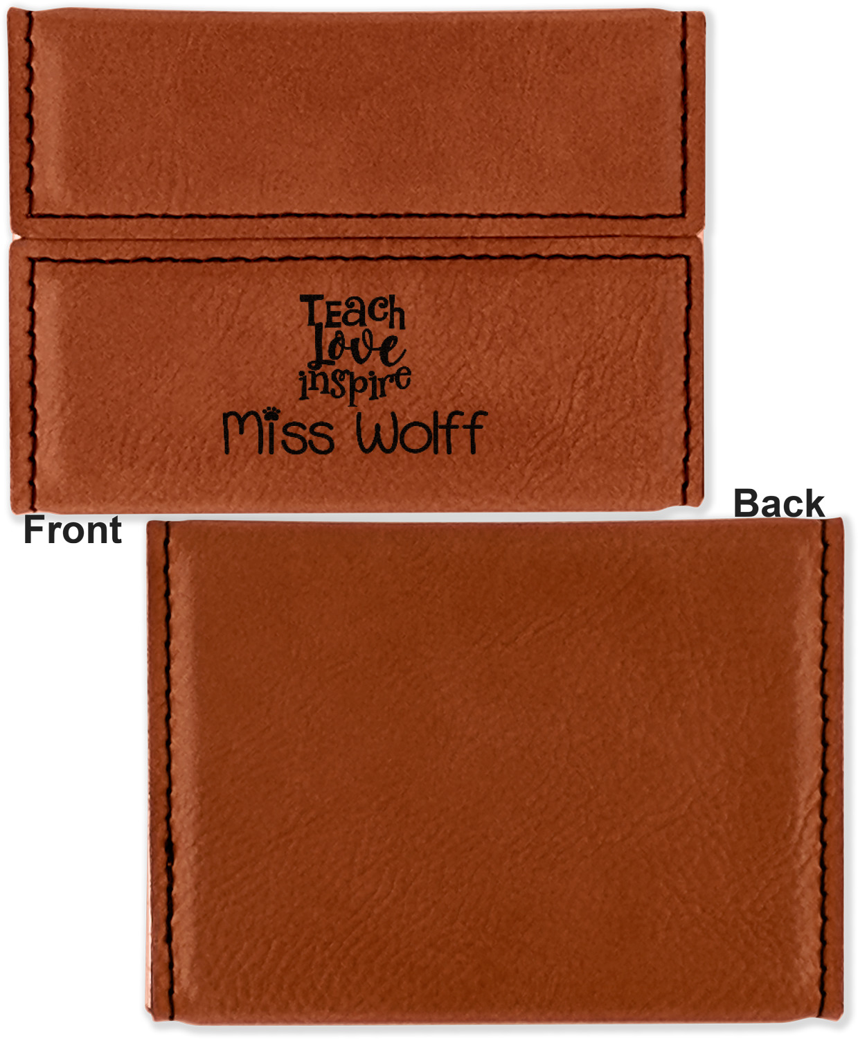 Your personalized design is laser engraved onto either the front, or the front and back of the card holder, depending on the model you purchase. Once engraved, the design will appear a darkened black against the cognac color of the leatherette.