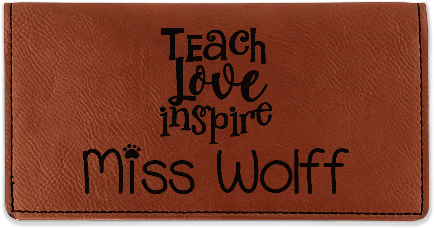 Go into our design center to start personalizing. Your checkbook cover will be laser engraved, making the graphic or text a black color. Choose a fun saying, monogram, or font to go on your checkbook cover. You have the opportunity to do it double or single sided.