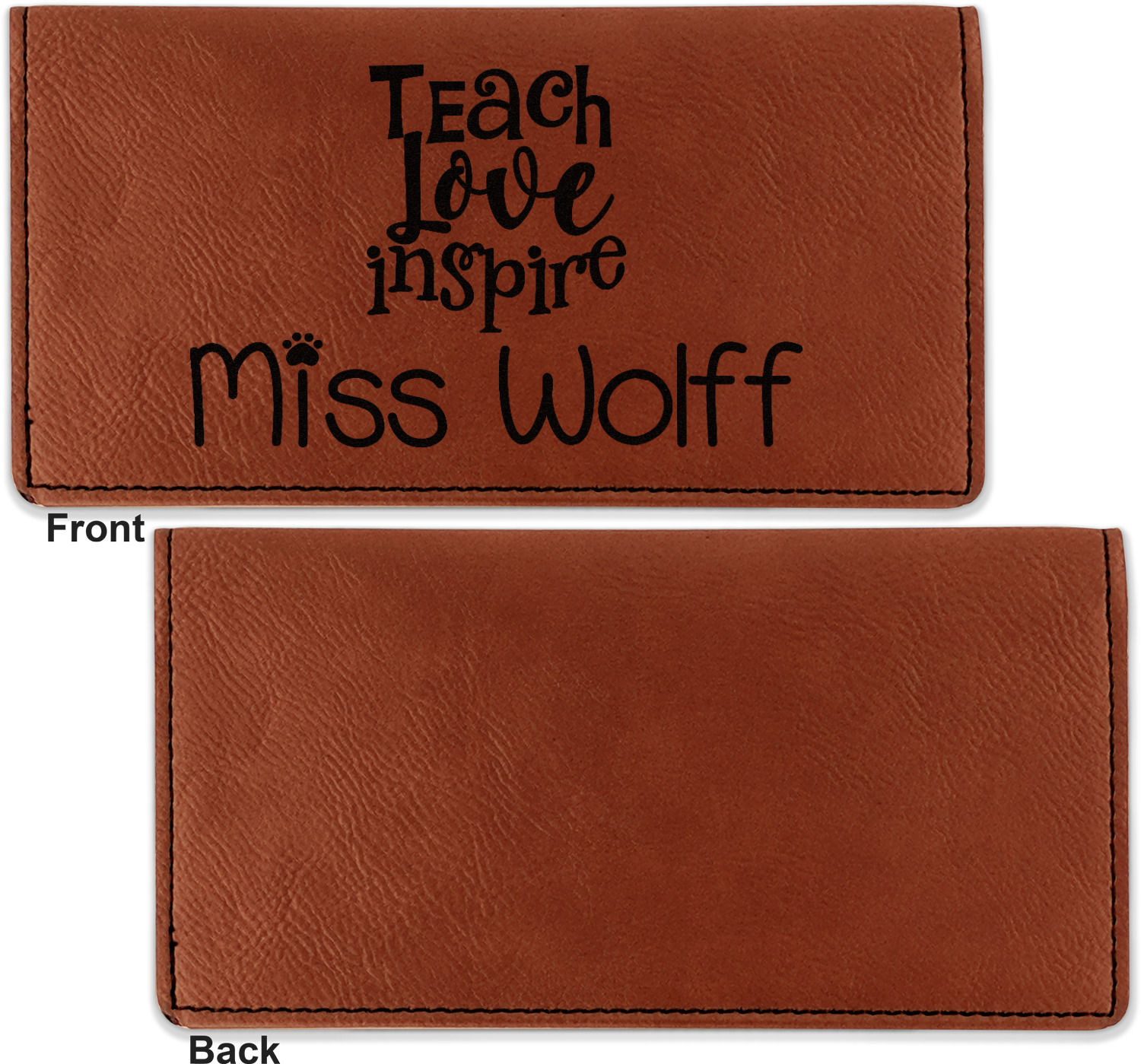 Go into our design center to start personalizing. Your checkbook cover will be laser engraved, making the graphic or text a black color. Choose a fun saying, monogram, or font to go on your checkbook cover. You have the opportunity to do it double or single sided.