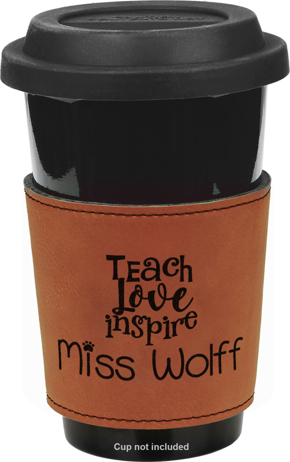 This cup sleeve is made from a suave, cognac-brown leatherette and finished with an intricate, black stitch. The interior of this can sleeve is fabricated from a thin foam material to help insulate your mug's contents. The sleeve is specifically made to suit tapered glasses or mugs, so the top's diameter is 3.5 inches, while the bottom's diameter is 2.75 inches. Your customized design will be laser engraved into the leatherette, leaving behind crisp, black imprint. With these products, we provide you with the option of engraving the front and back, or the front only.