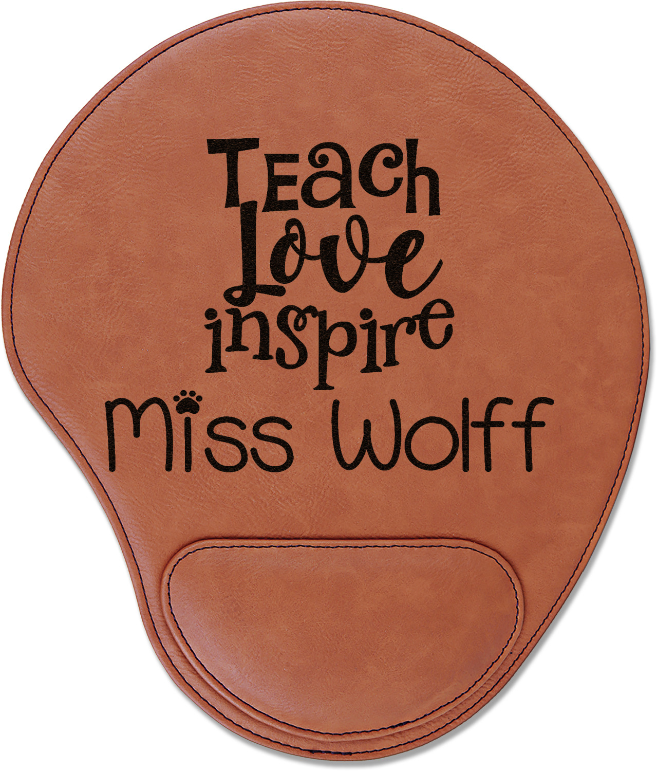 In a rounded shape, this mouse pad is made of a luxurious, cognac-colored leatherette. The nature of this material allows your mouse to glide smoothly across its surface. Strong stitching lines the edges to guarantee stability and strength. As added support for tired wrists, your personalized mouse pad features a supportive wrist rest at its bottom. This model measures at 10.25" x 9", while its wrist pad is approximately 5" x 2.75", with a thickness of 0.75". Your personalized design is laser engraved into the front face of this mouse pad.
