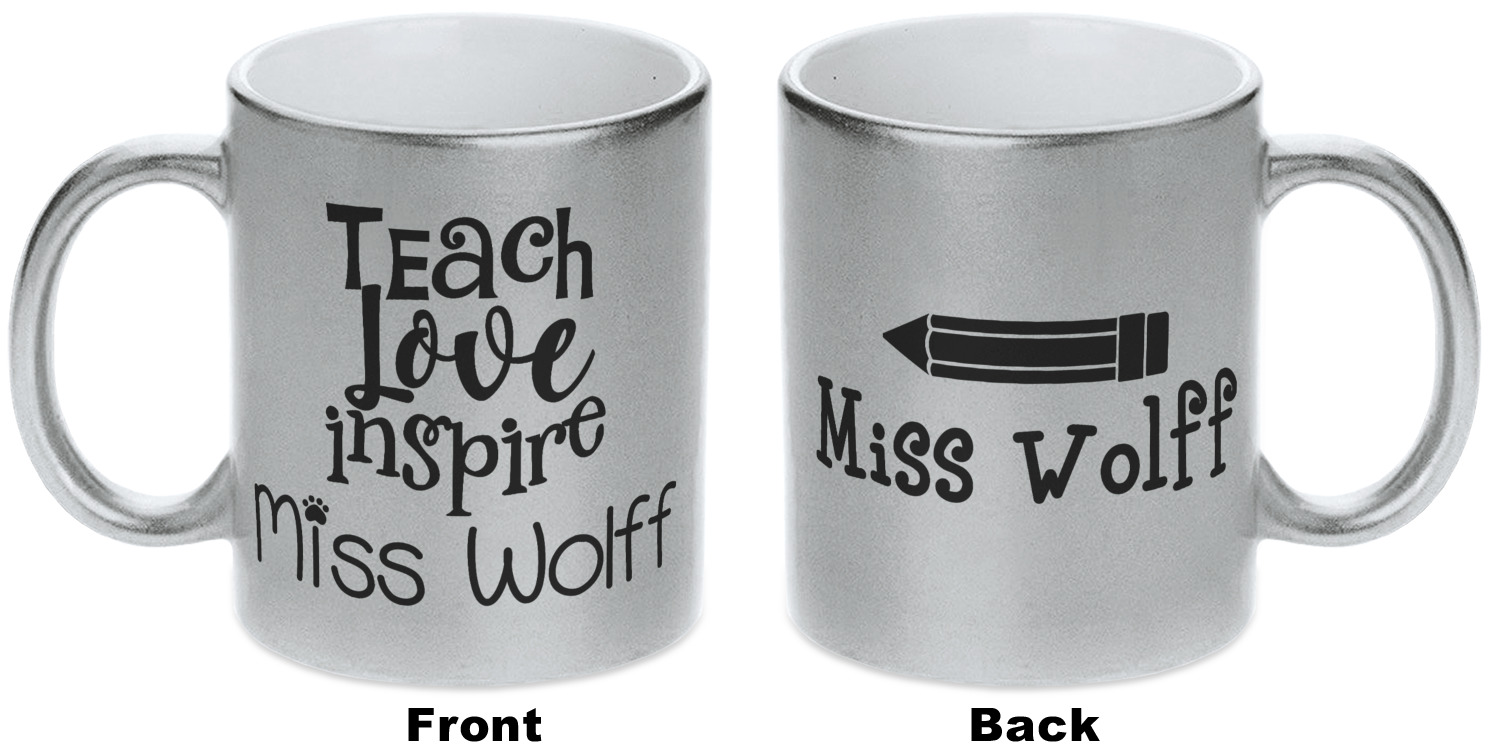 Our custom mugs are ceramic, which is great for keeping your tea or coffee warm! We offer two metallic mugs to personalize - Silver or Gold. Both styles hold around 11oz and have dimensions of approximately 3.75" x 3.5" x 4.75". Both the metallic mugs come in a matte finish and have glitter detailing to add a more pristine feel to the gold and silver base colors.