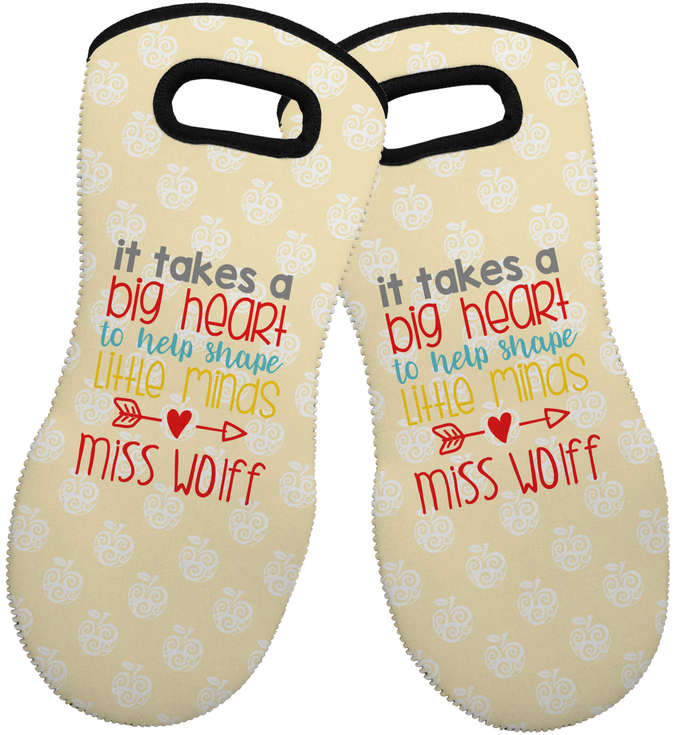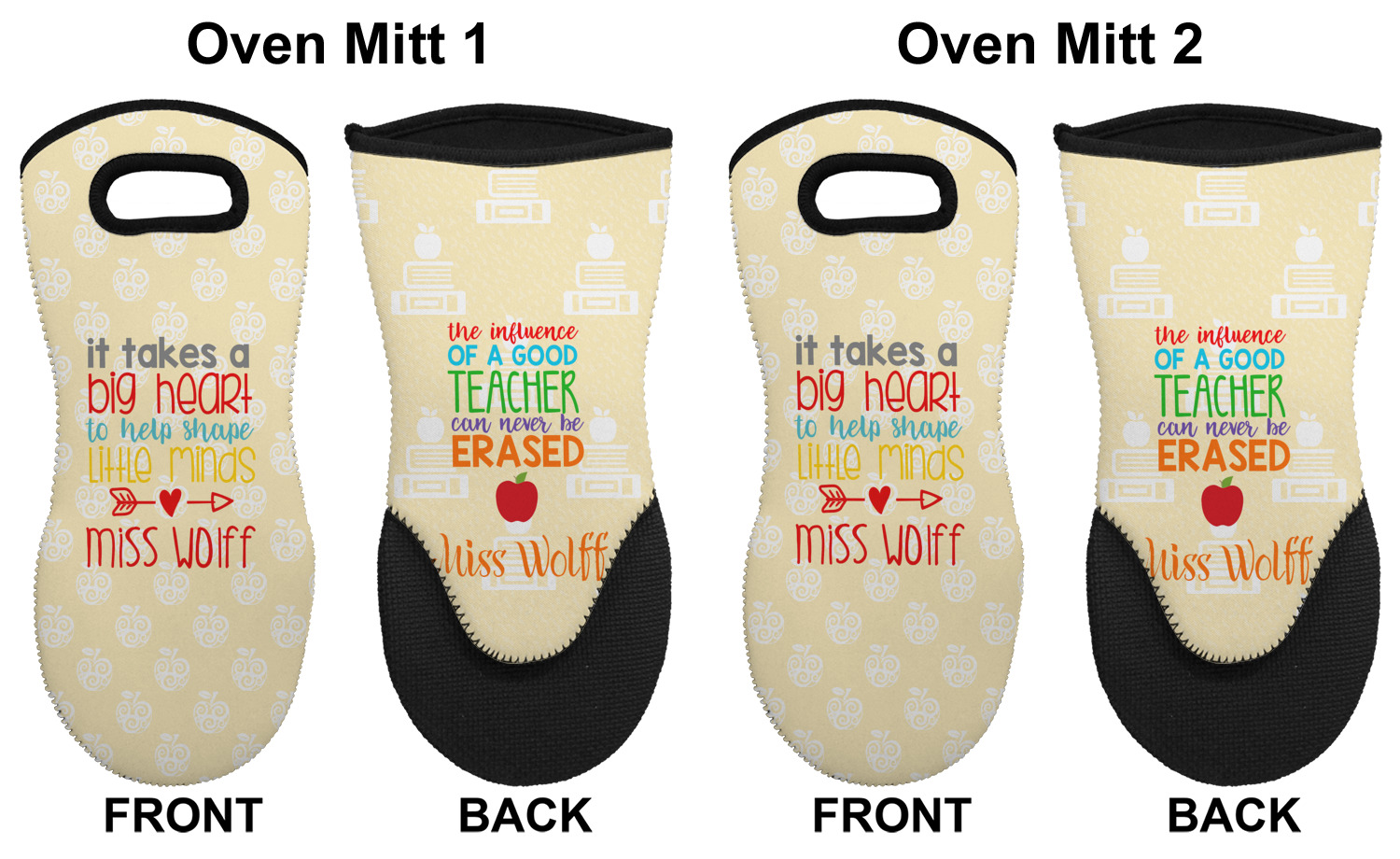 These heat resistant gloves are made entirely of a durable neoprene; the front features a softer texture, while the palm's side has a textured surface, meant to handle heat up to 500 degrees Fahrenheit. Thick, heavy duty stitching connects the two sides. A small, oval cutout appears on the front, and can be used to hang and store the mitt. Your personalization appears on the front, and the upper part of the back of the mitt. The style of these oven mitts are suitable for both the right and left hand, depending on your needs. If you need one for each hand, be sure to order two!